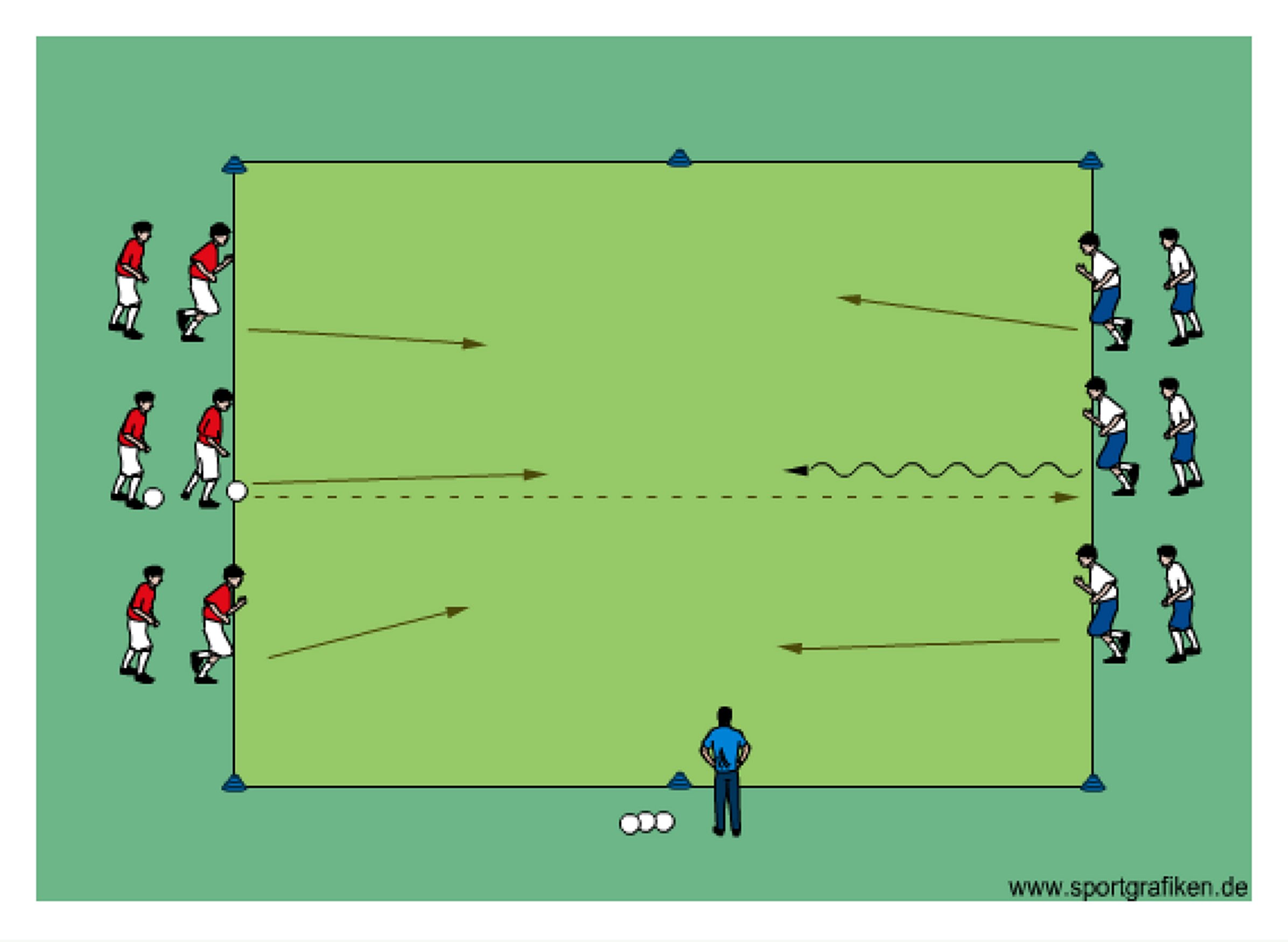 - once pass is received all players can enter the grid to play 3v3 until a player dribbles across the opponent's end-line with control