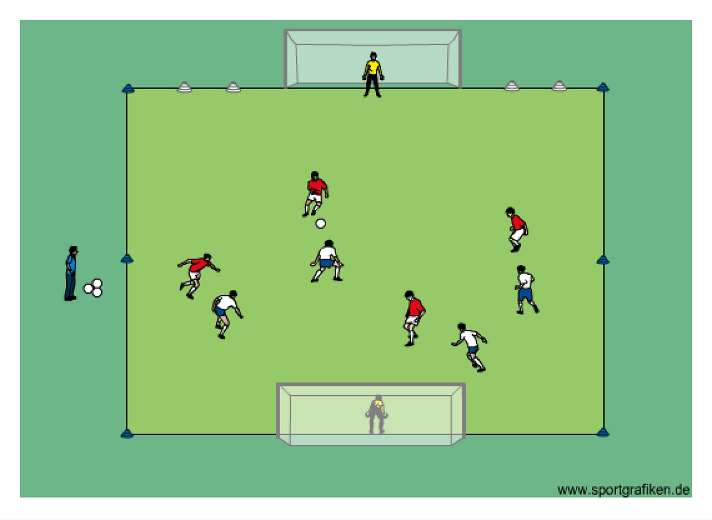 - attackers (red) defend goal with goalie and cone goals