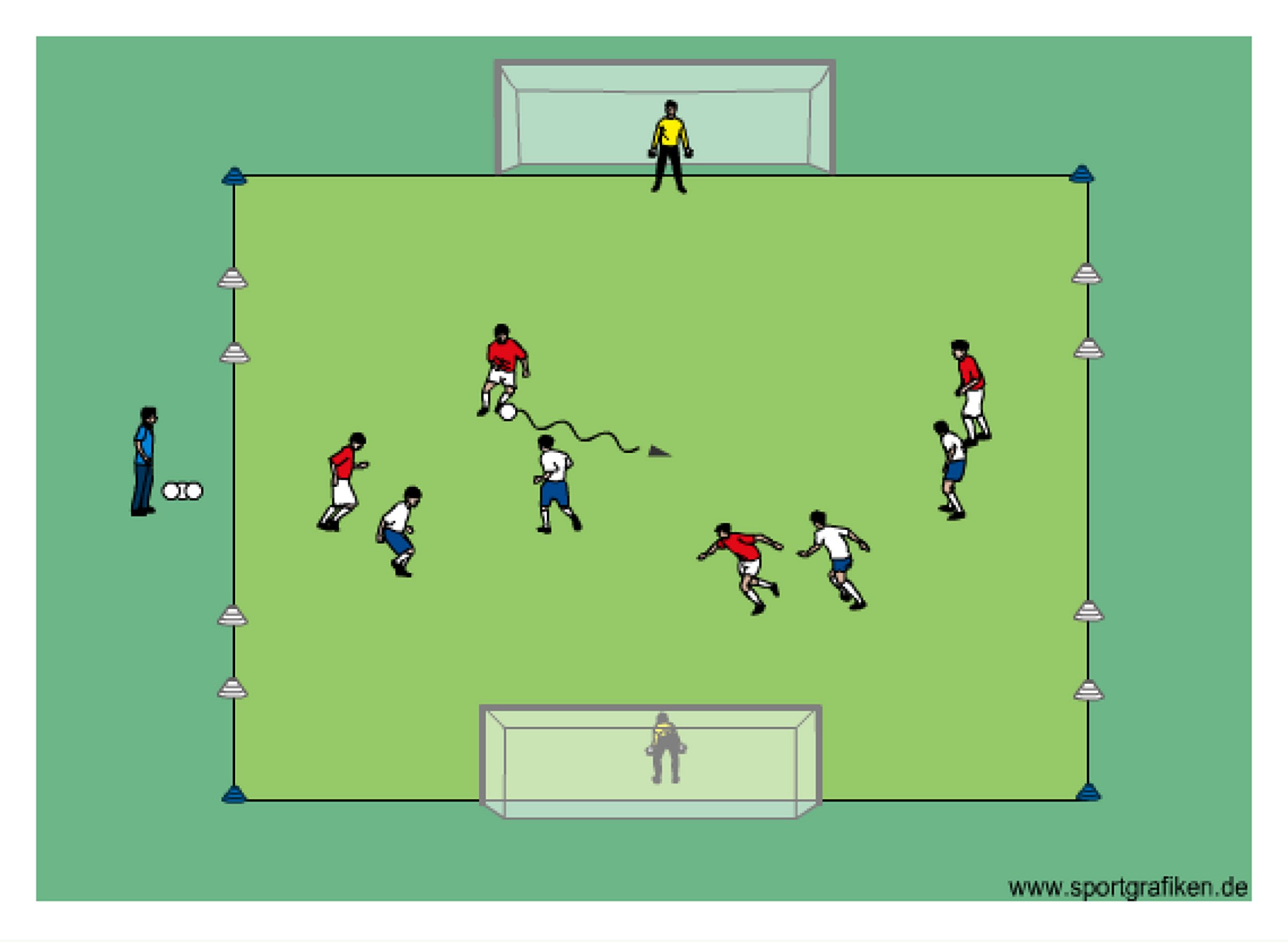 - each team is assigned one side line (with cone goals) and one reg. goal to defend