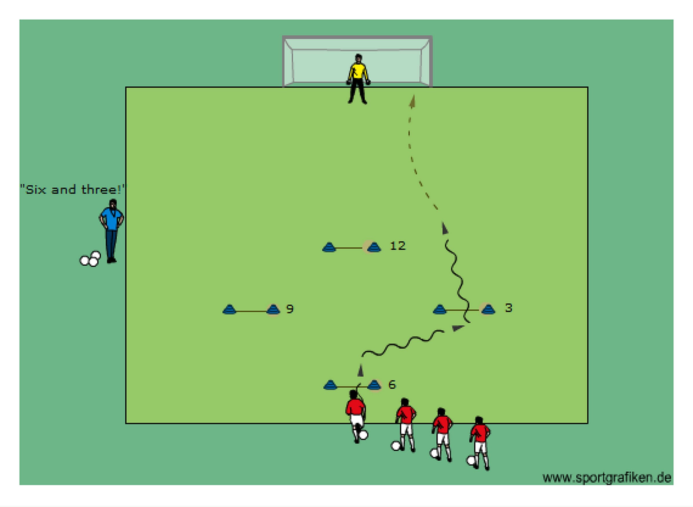 - coach calls out two goals to which the first player has to dribble through and then finish on goal