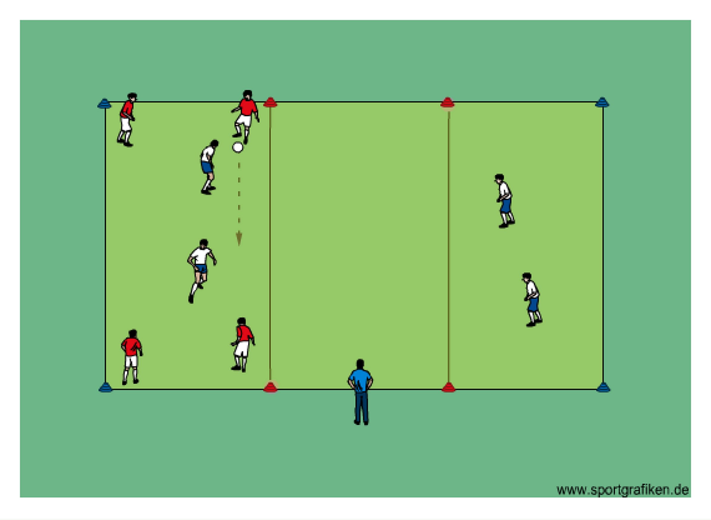 - if defenders win the ball, they pass it to the other grid, join their teammates and play 4v2 against two red players in that grid