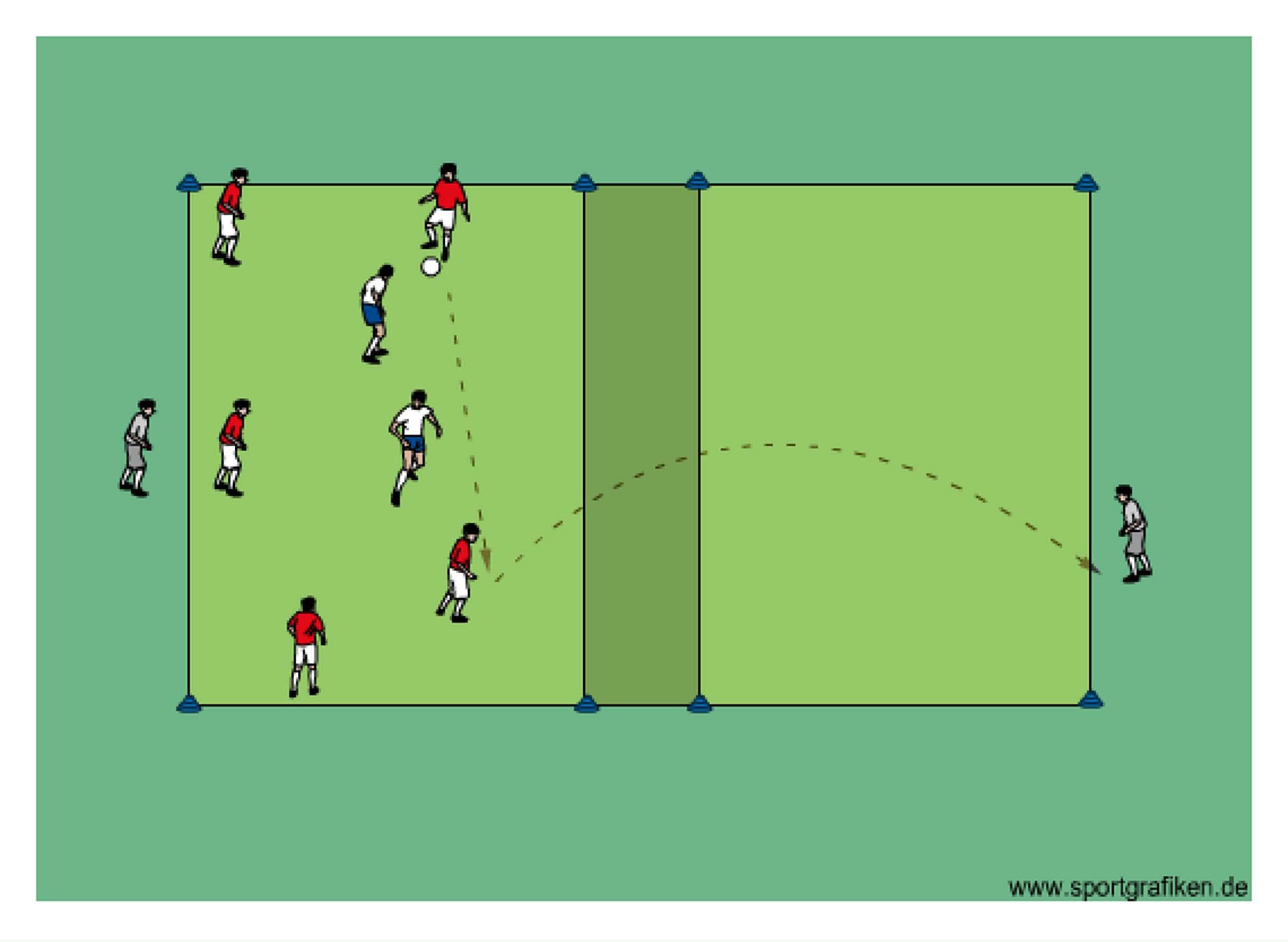 - attackers try to make lofted passes to a target player at the opposite end of the grid as shown