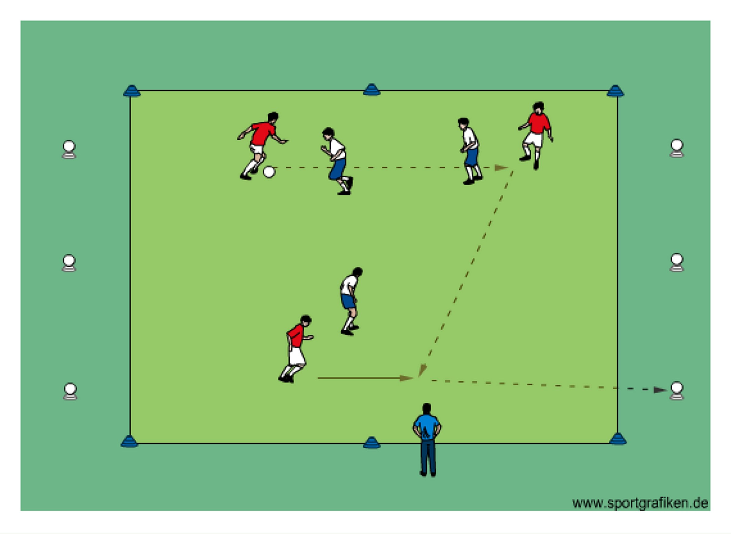 - players attempt to keep possession and knock down balls which are placed on flat cones as shown