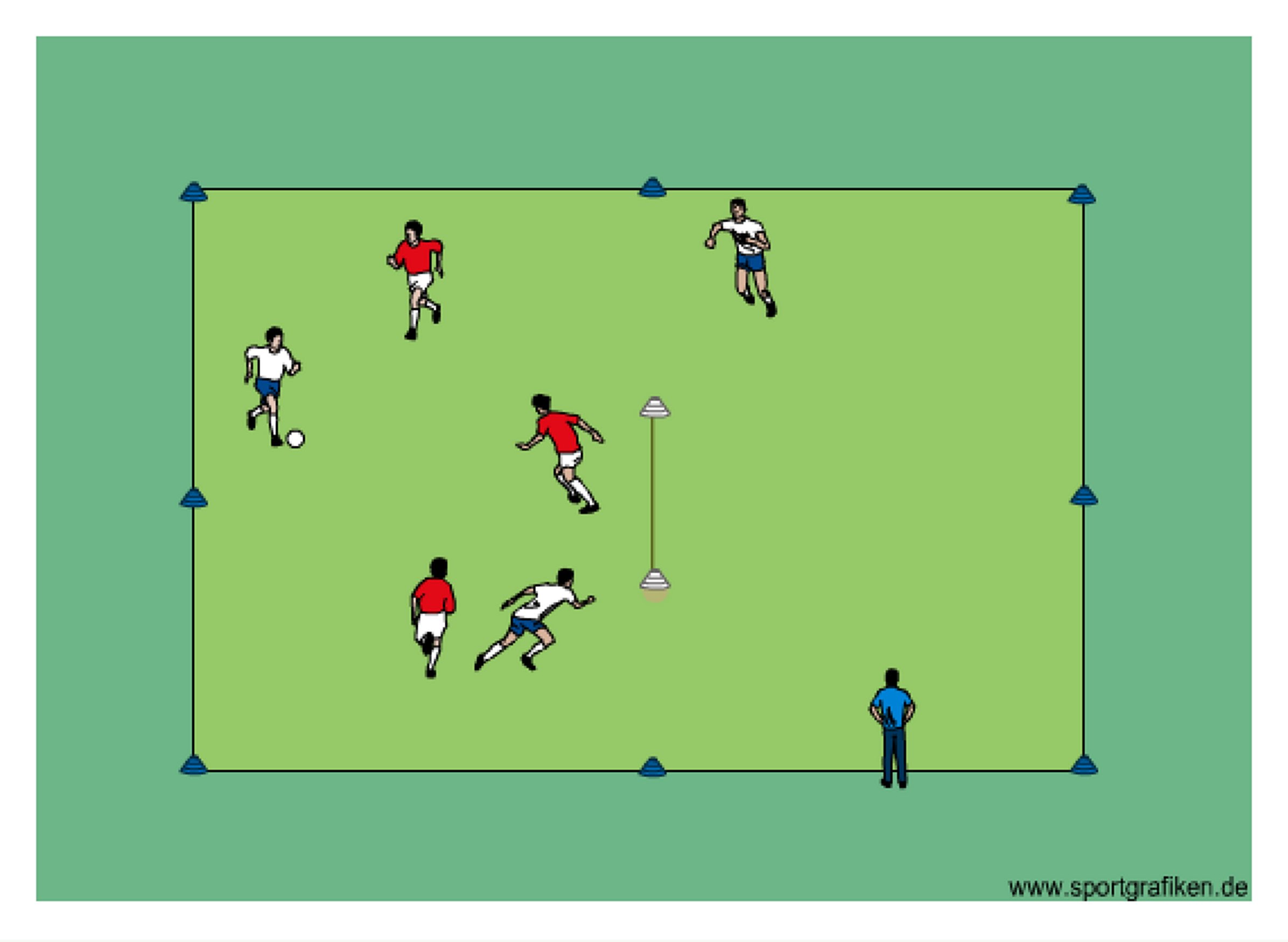 - one team scores by dribbling through one side of the goal, the other team scores by dribbling through the other side