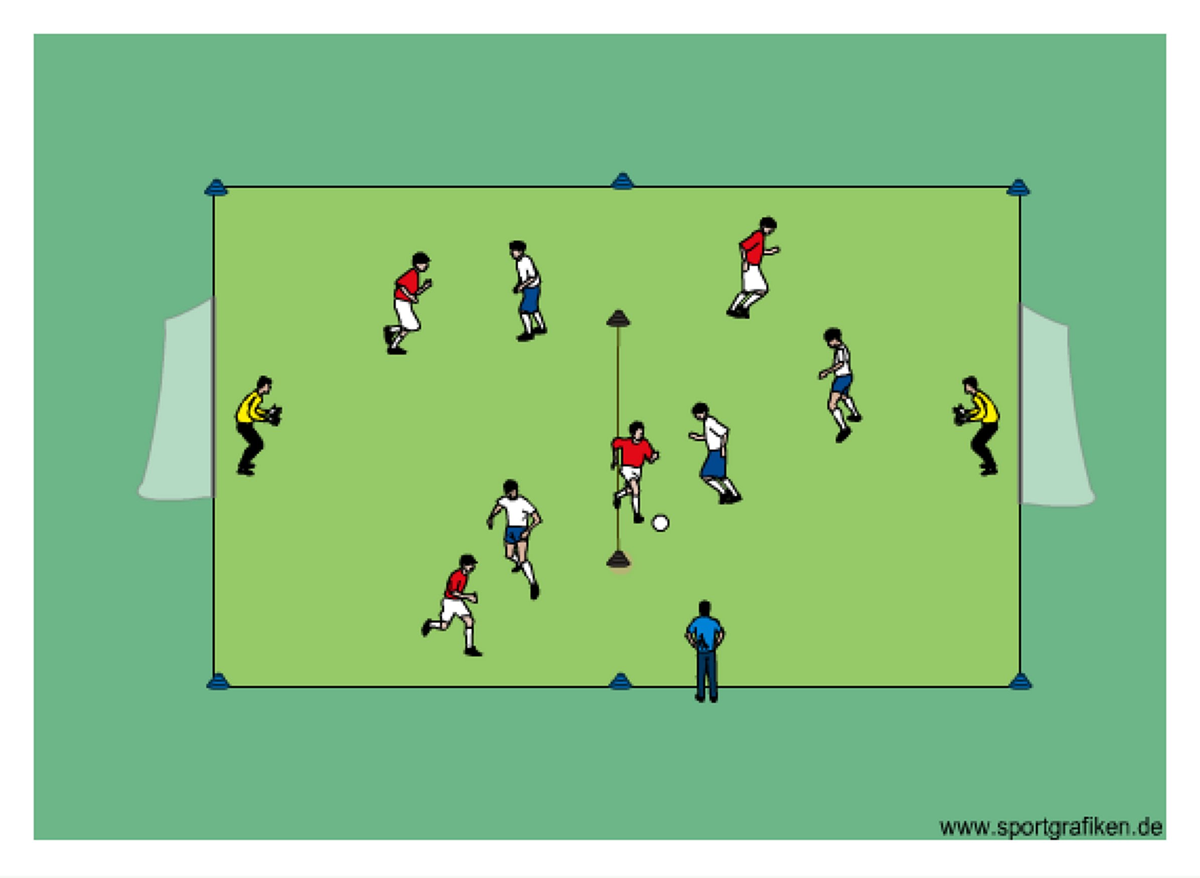 • teams score 2 points if the ball is dribbled through the middle cone goal before player scores a goal otherwise only one