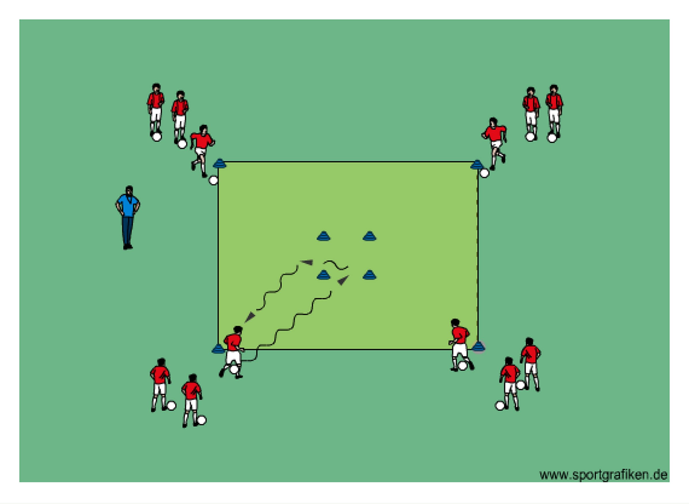 - players dribble around all cones of the inner square (clockwise or counterclockwise direction)