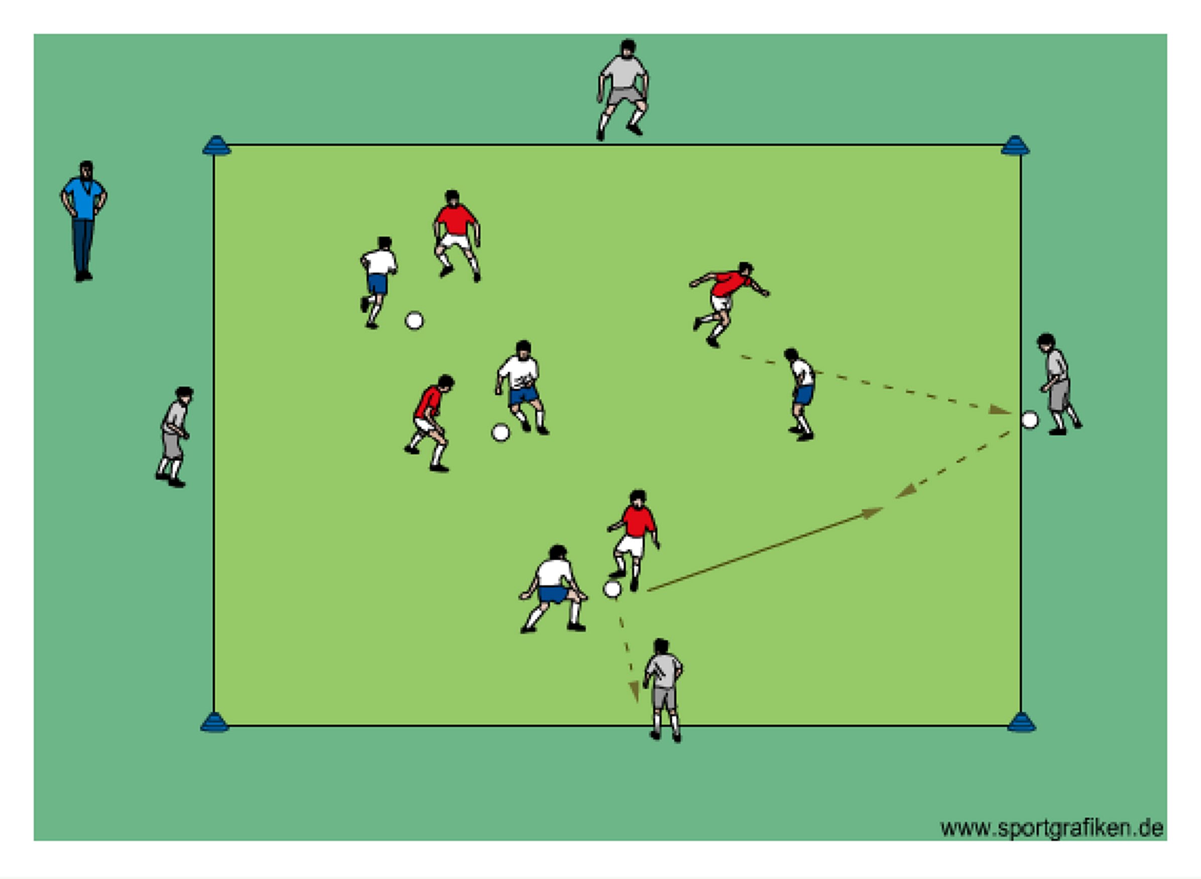 - players inside the grid score by passing to a neutral player who doesn't have a ball