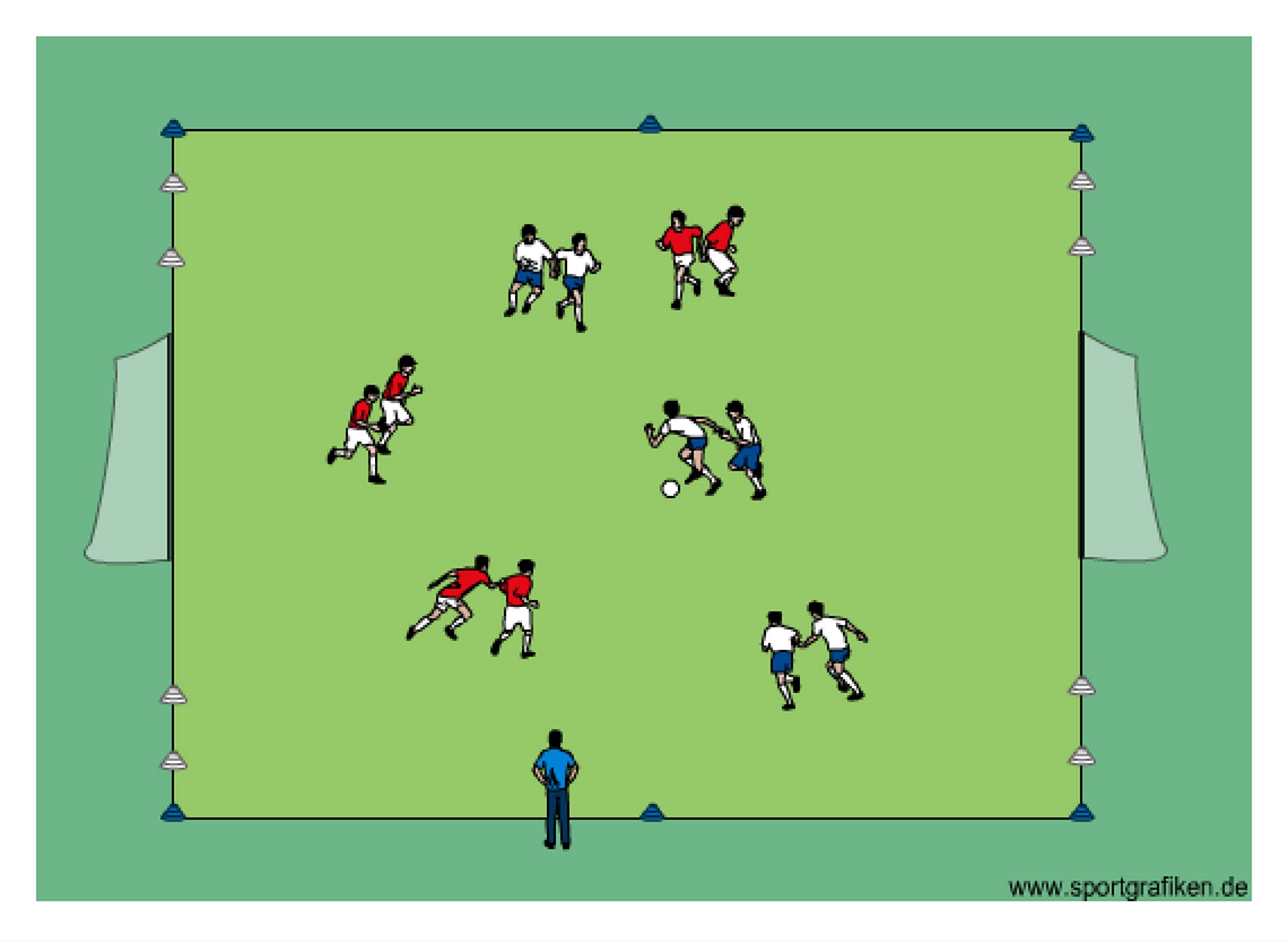 - each team attacks and defends a goal - no goalies (2 points) and two cone goals (1 point)