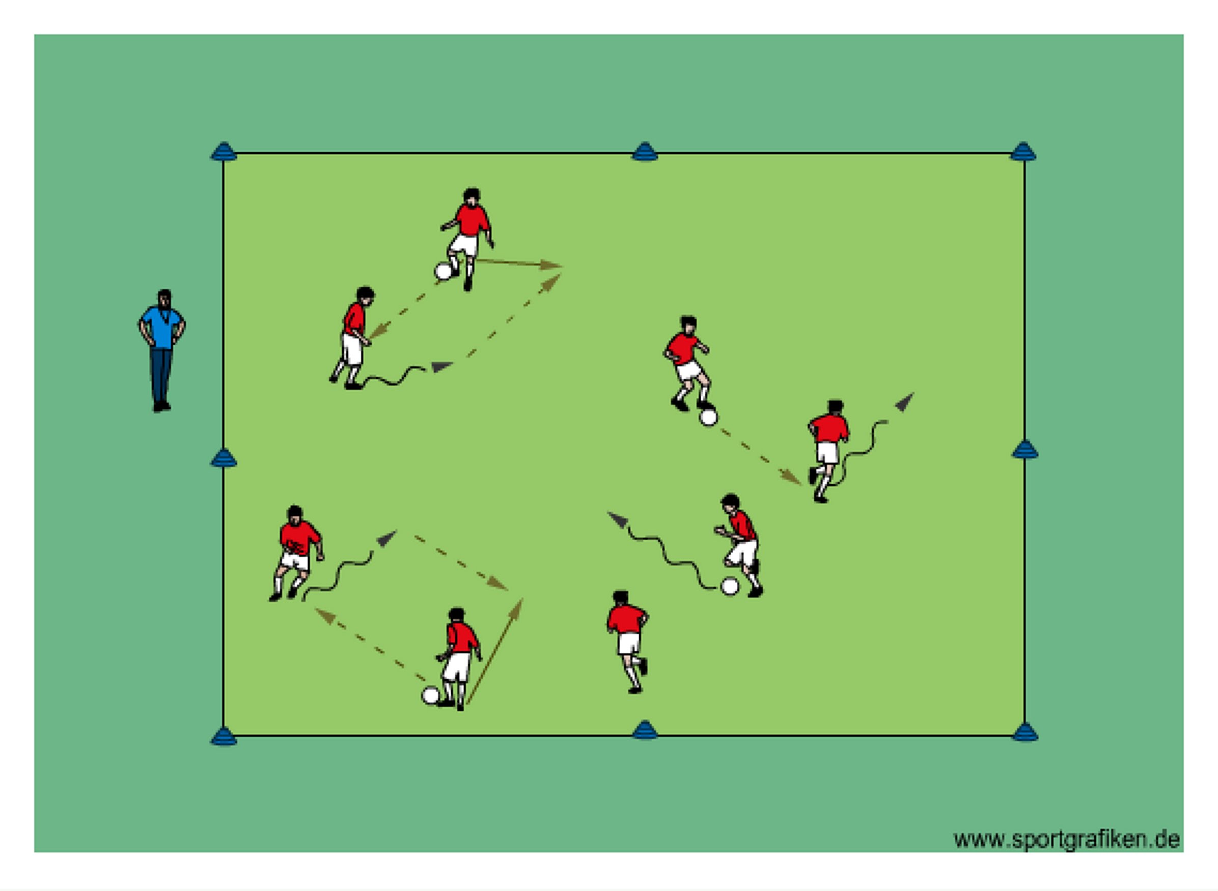 - players dribble with speed 3-4 steps in any direction with the ball after receiving a pass