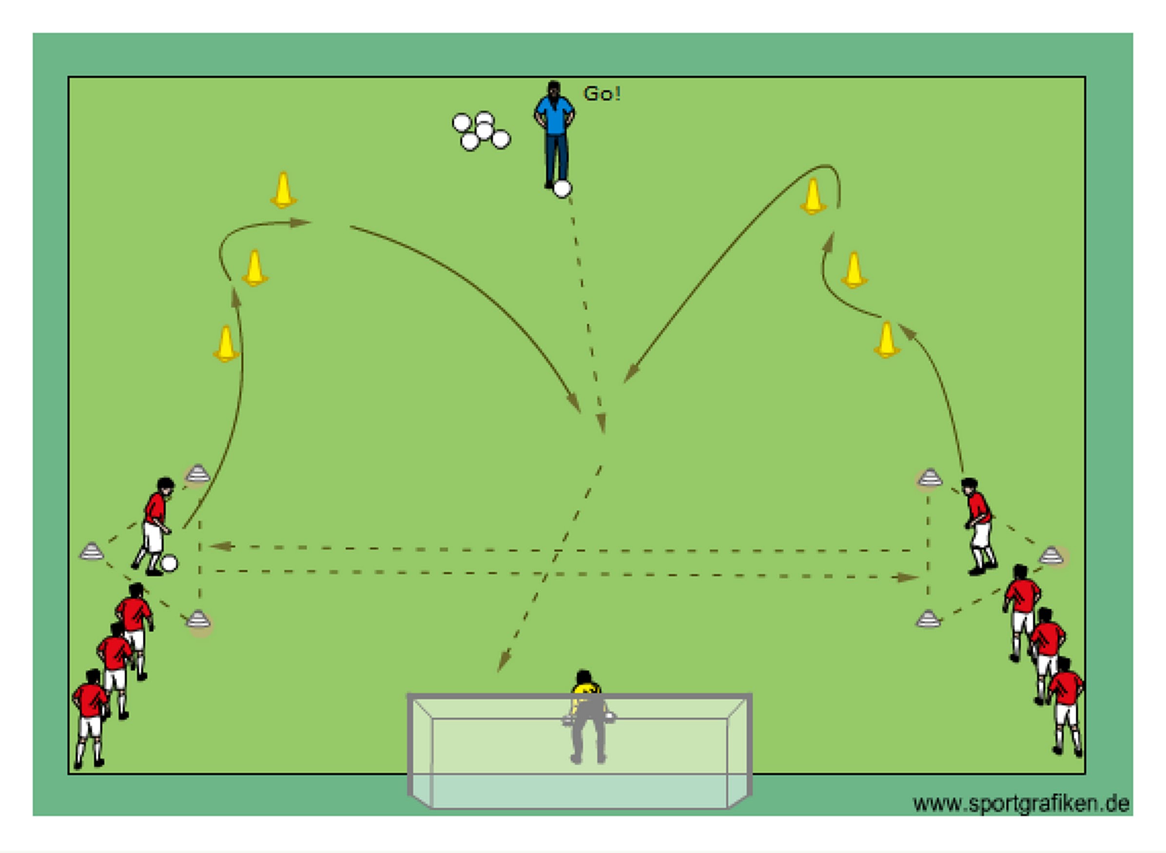 - on coach's command players run zic-zac around cones and first player to the ball takes a shot at goal