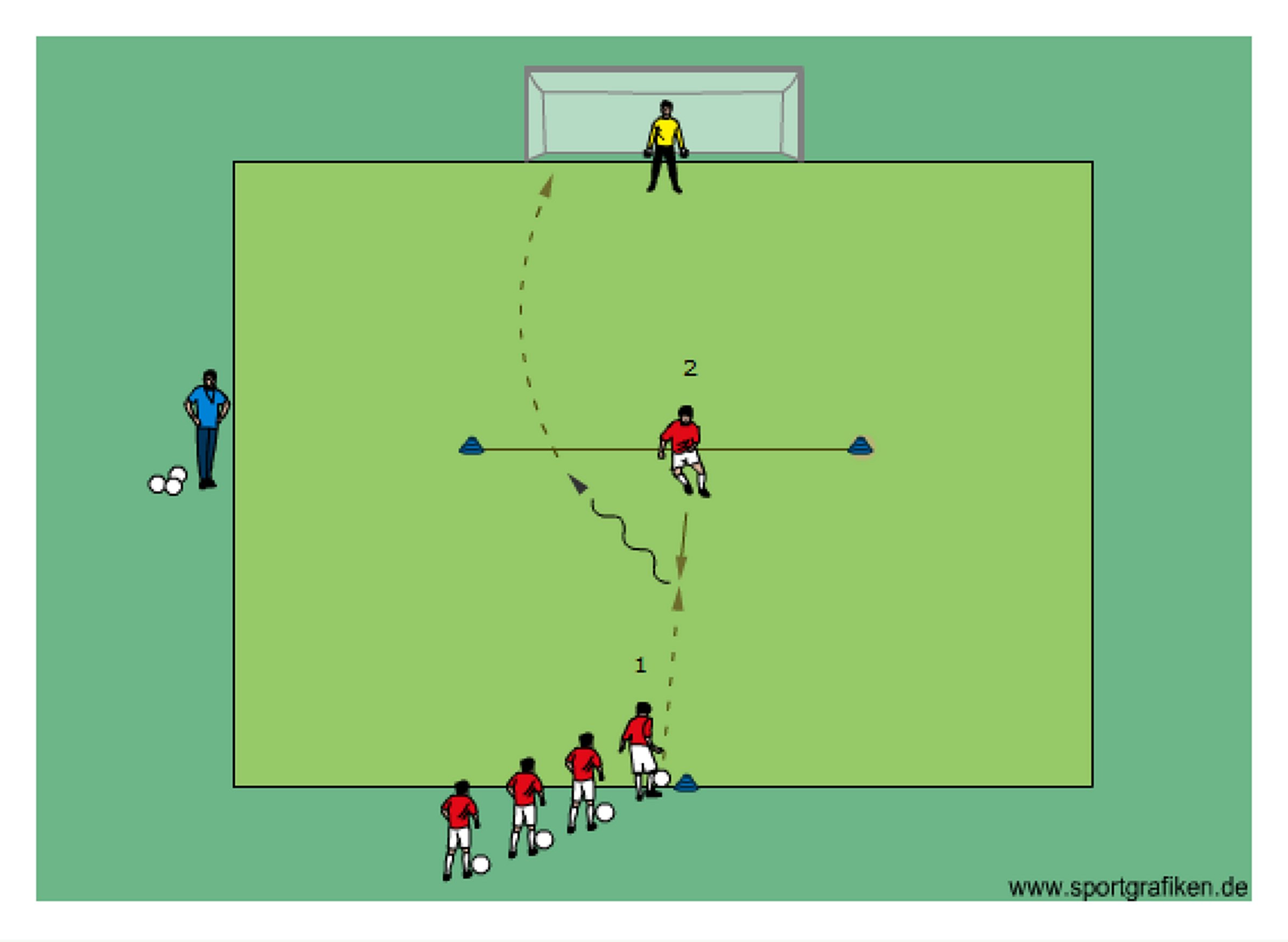 - player 2 moves towards player 1 to receive the pass, turn and shoot on goal