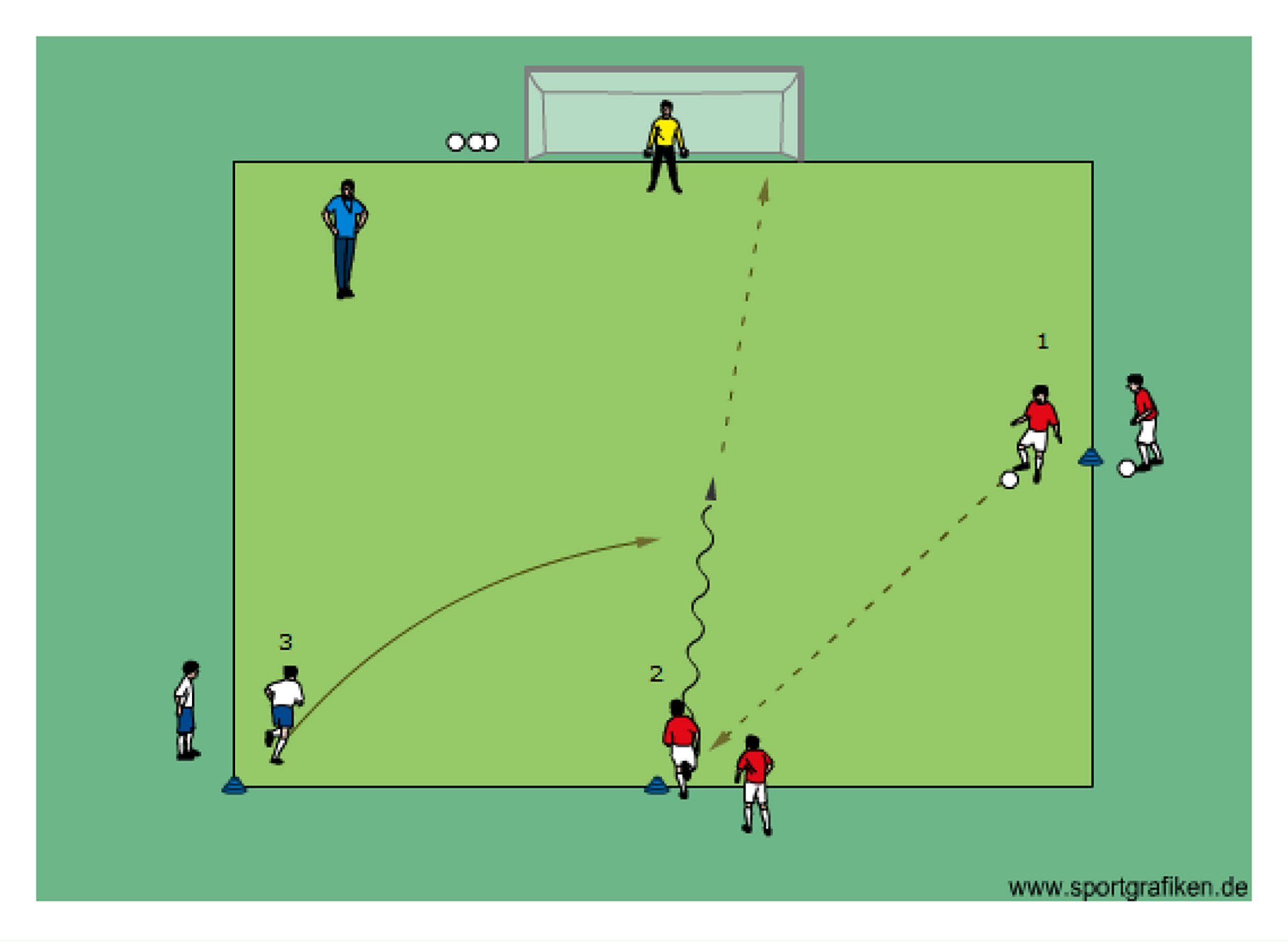 - player 1 passes to player 2 who tries to finish on goal