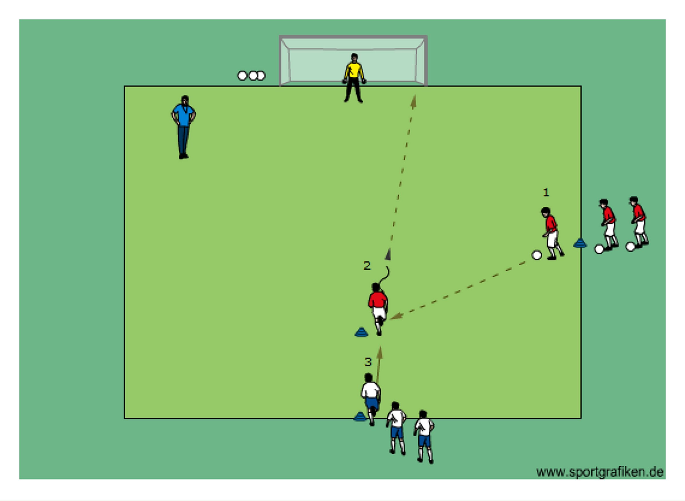 - once player 2 receives the ball player 3 starts from his cone to defend player 2