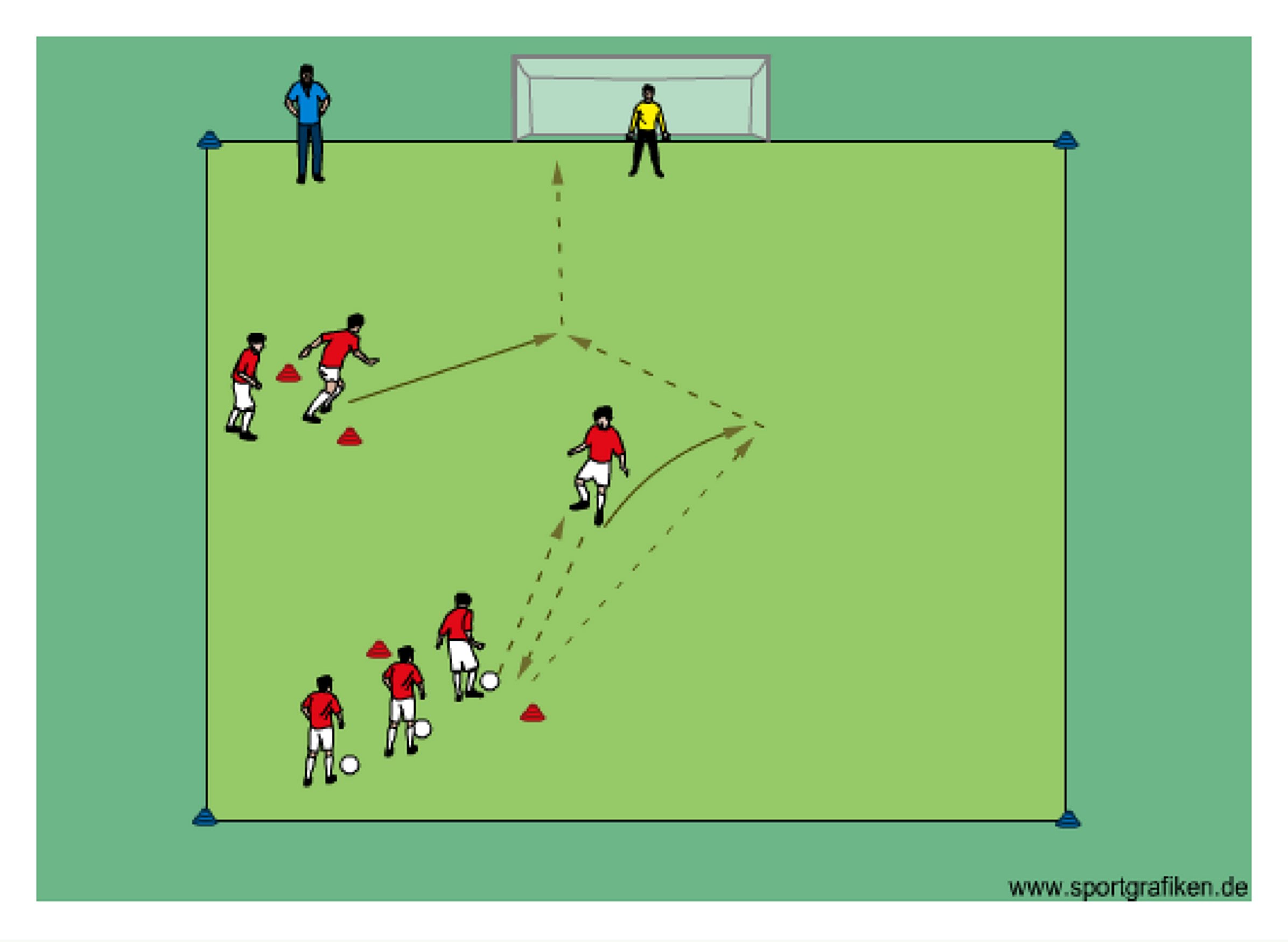 - players pass and finish on goal as shown