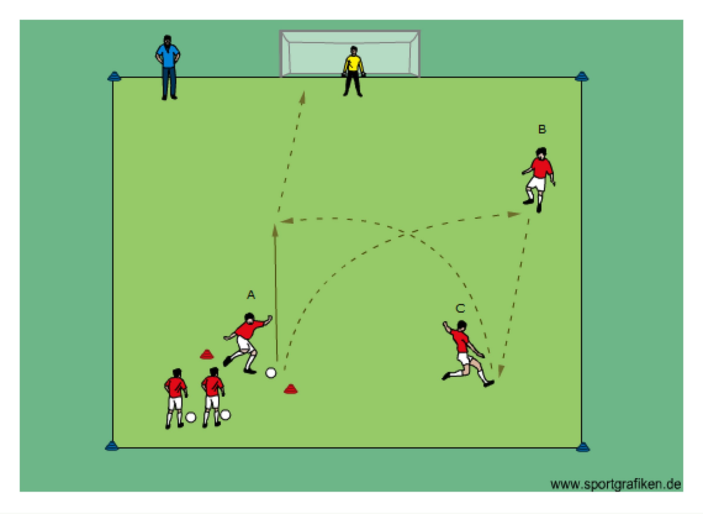 - players A plays a long pass to player B who lays it off to player C who plays a long pass back to player A who