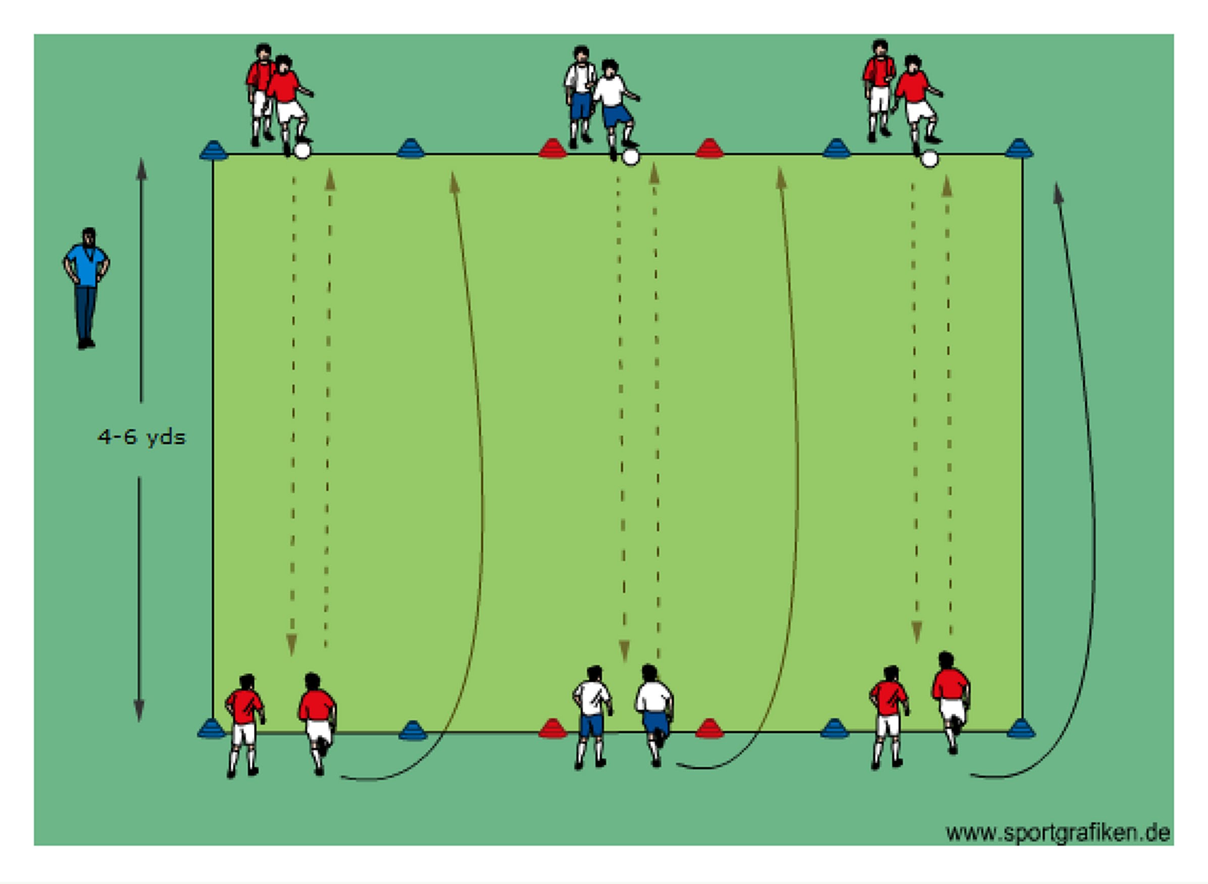 • players pass to their partner who takes it to the other side of the cone to pass it back as shown