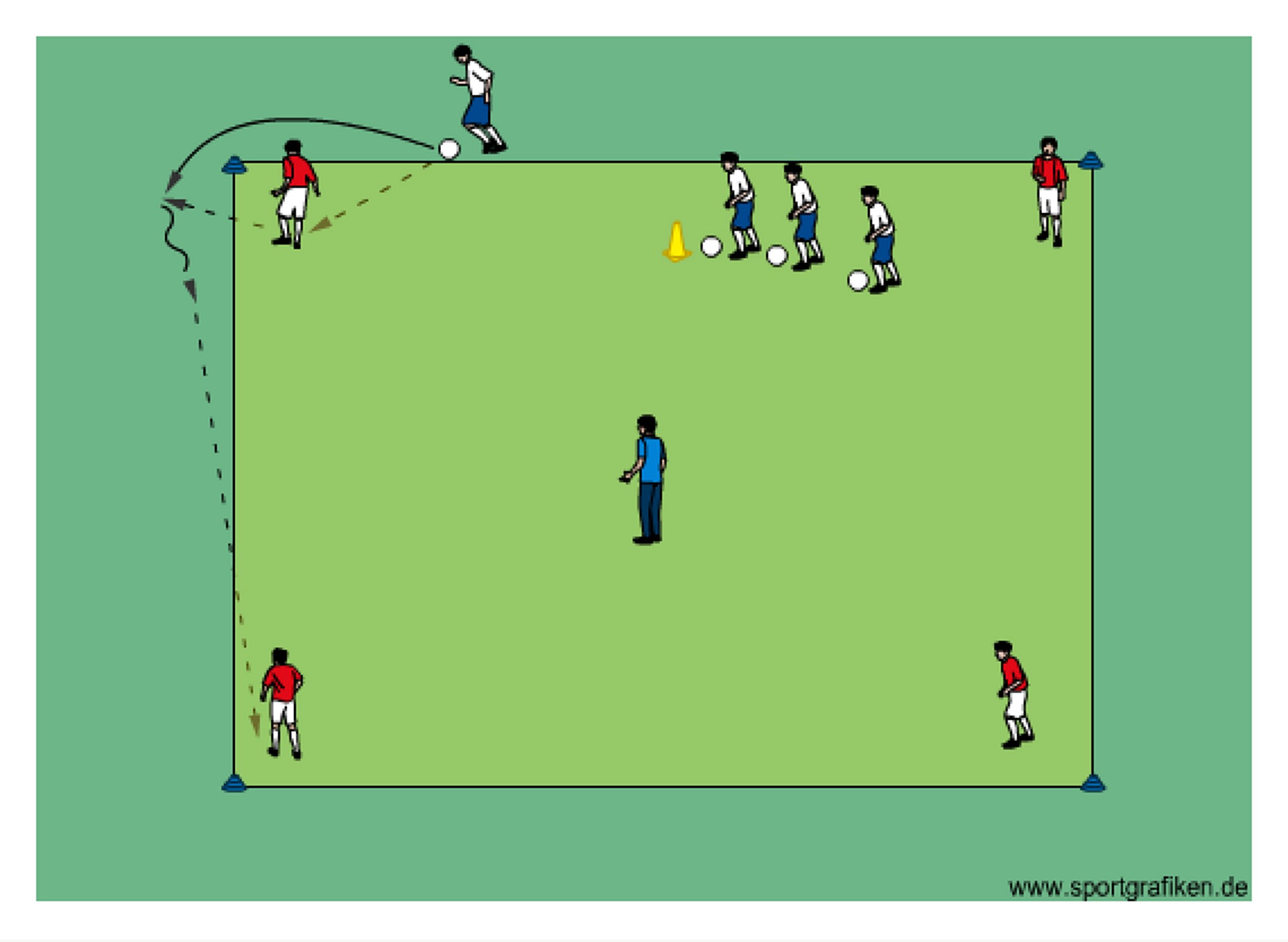 - red players stand right in front of the cones and lay off the ball to either the outside or the inside of the square