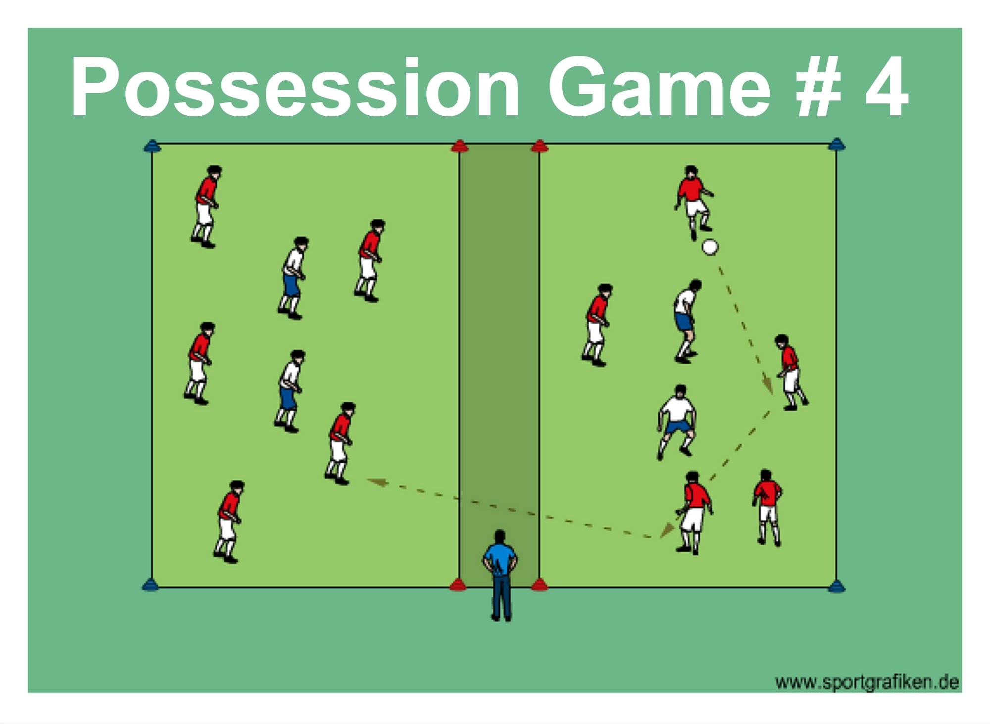 - red team has to complete three passes before passing the ball (across middle zone) to the other red team to do the same