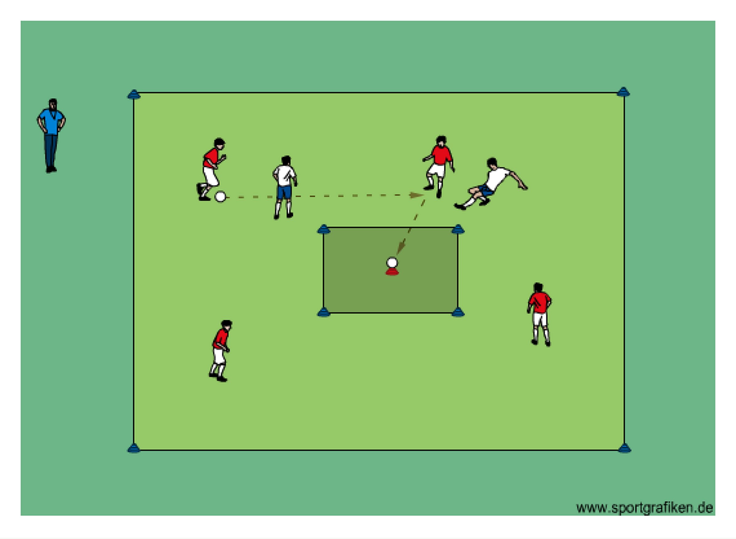 • team in possession scores by passing the ball to knock off the ball which is placed on top of a cone in the center square