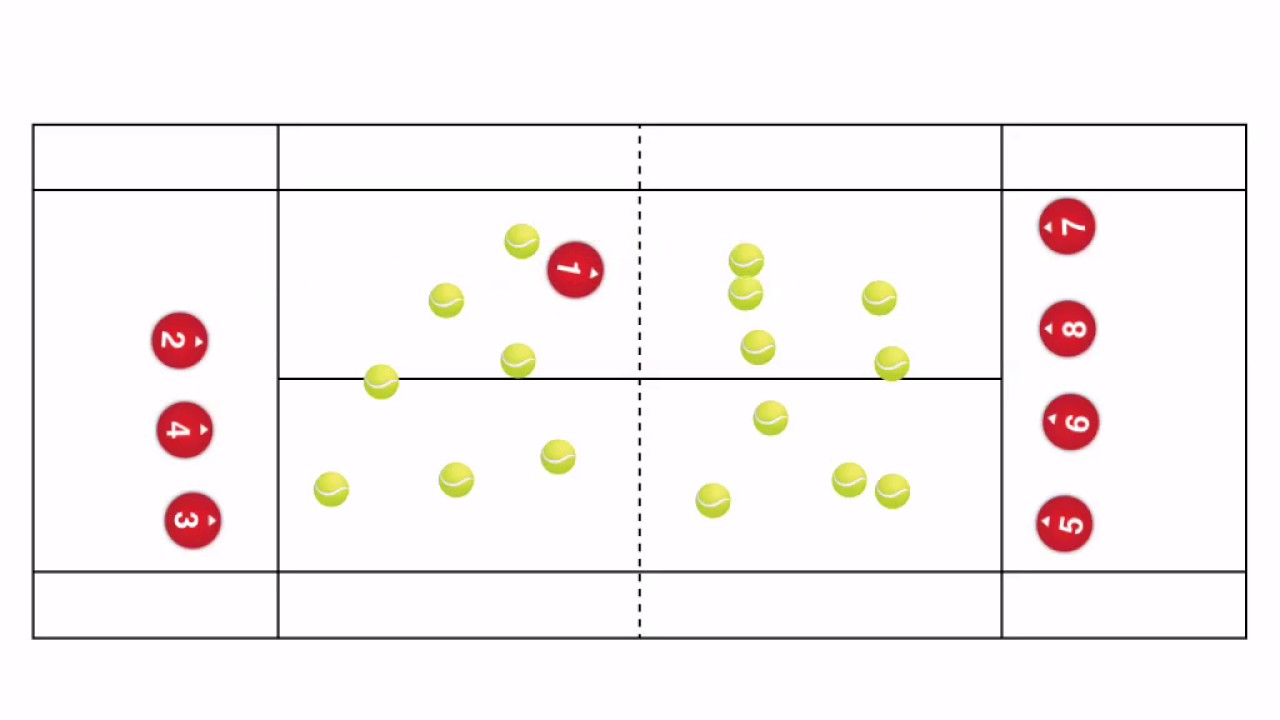 - Continue with three crosscourt shots followed by a down-the-line shot