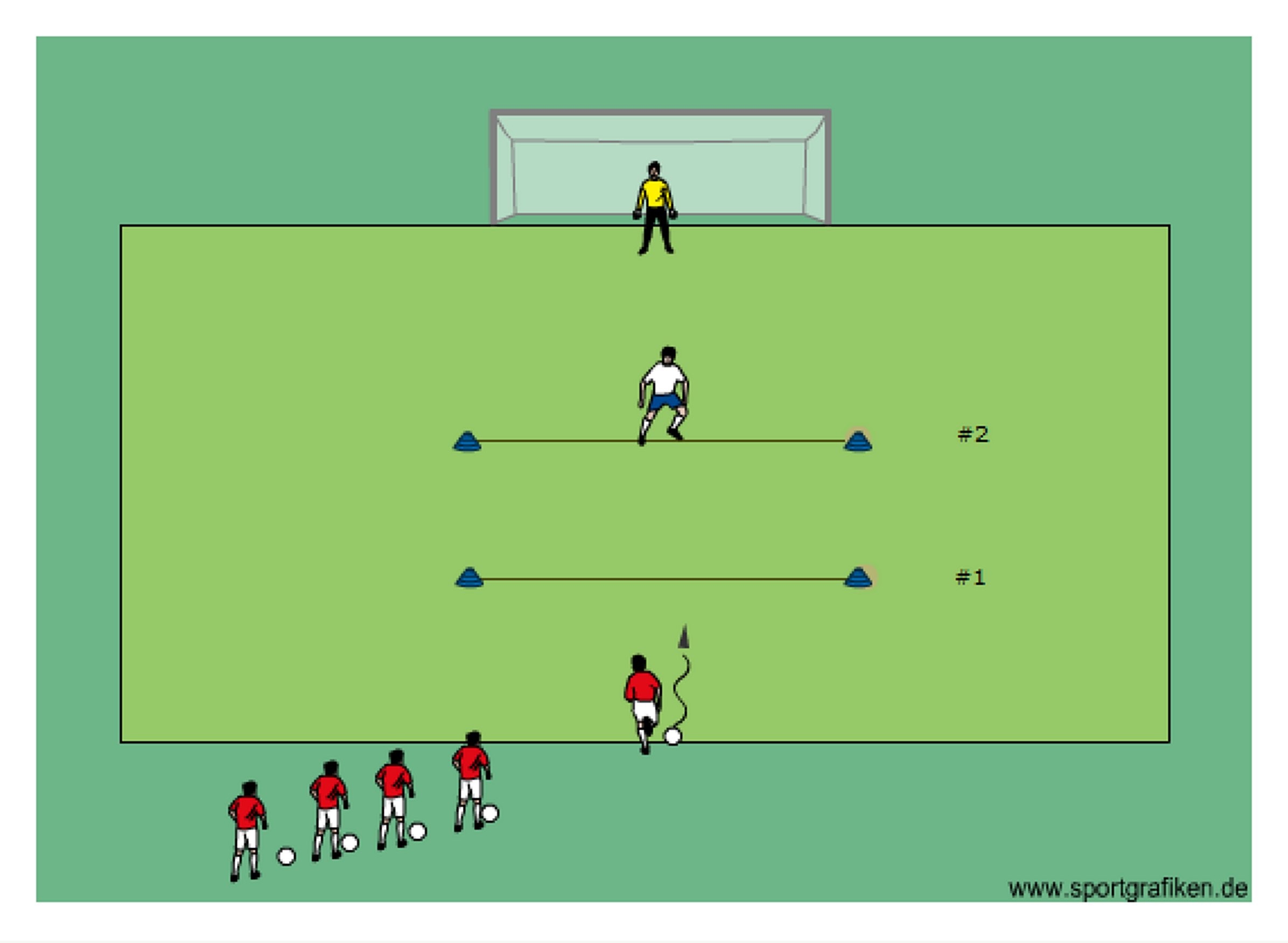 - once the attacker dribbles through cone goal #2 he must finish on goal with his first touch