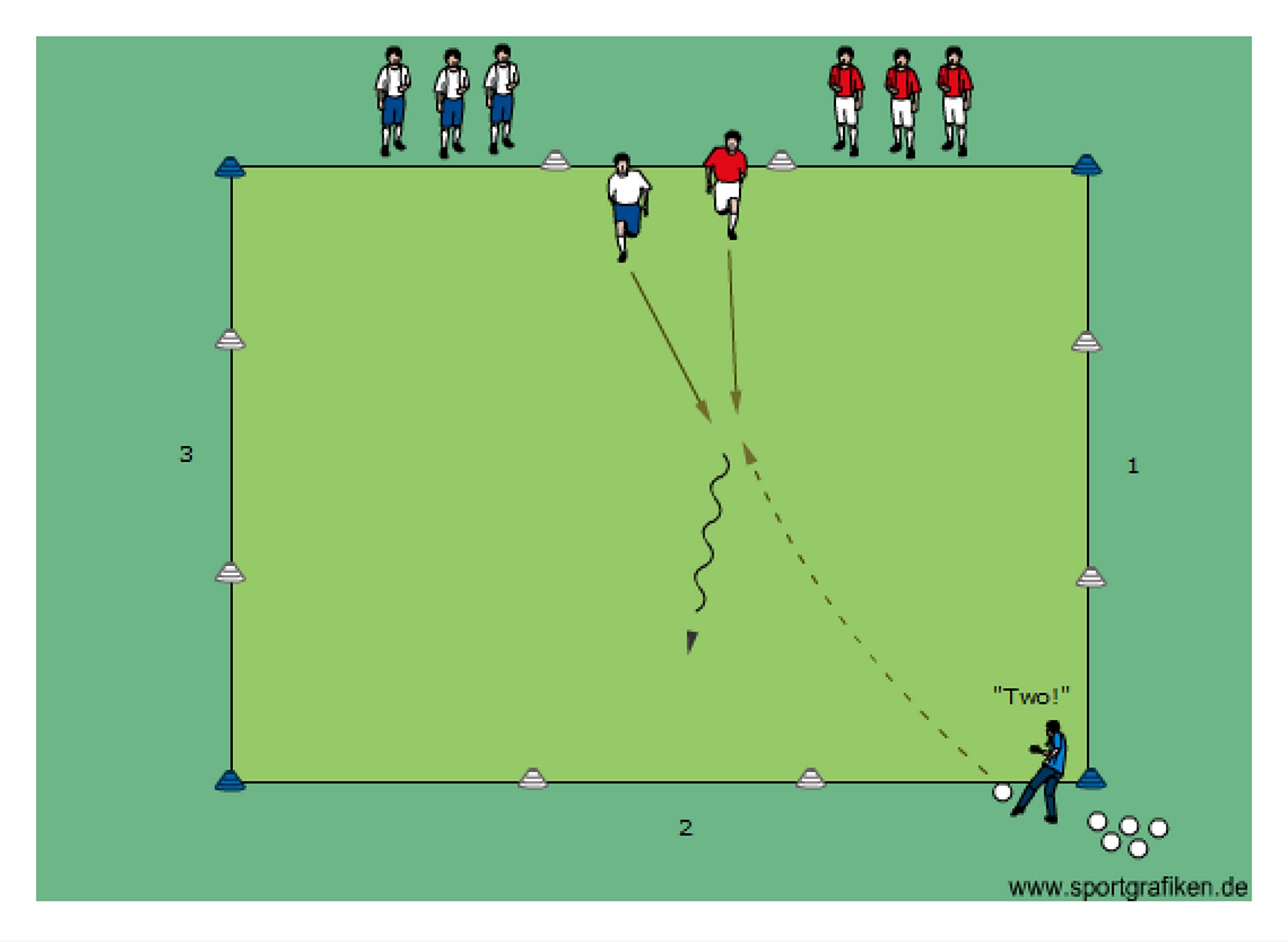- when coach calls out a number players (1v1) can score by dribbling through the cone goal with that number