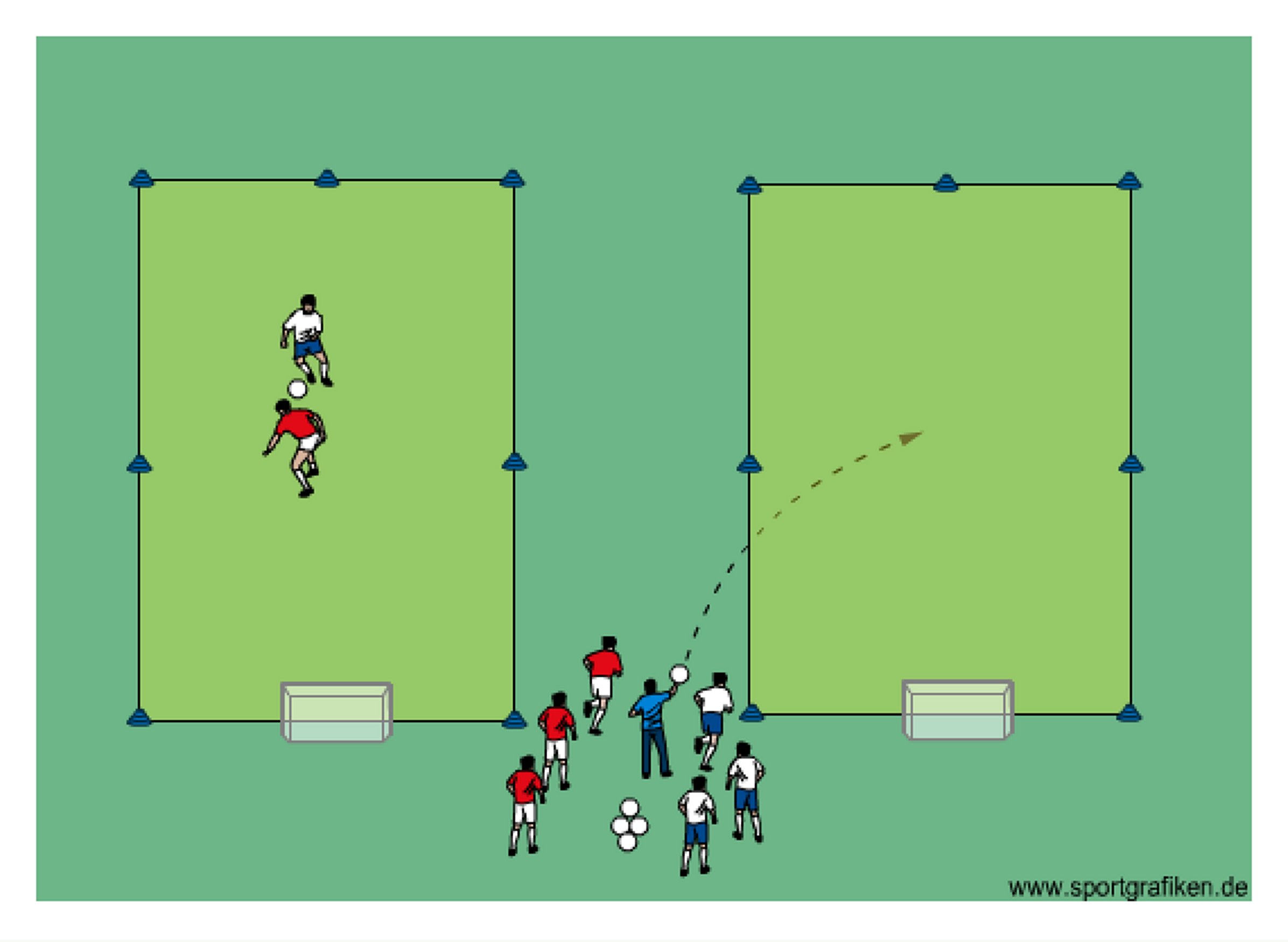 - players dribble through cone goal to take on defender in a 1v1 situation