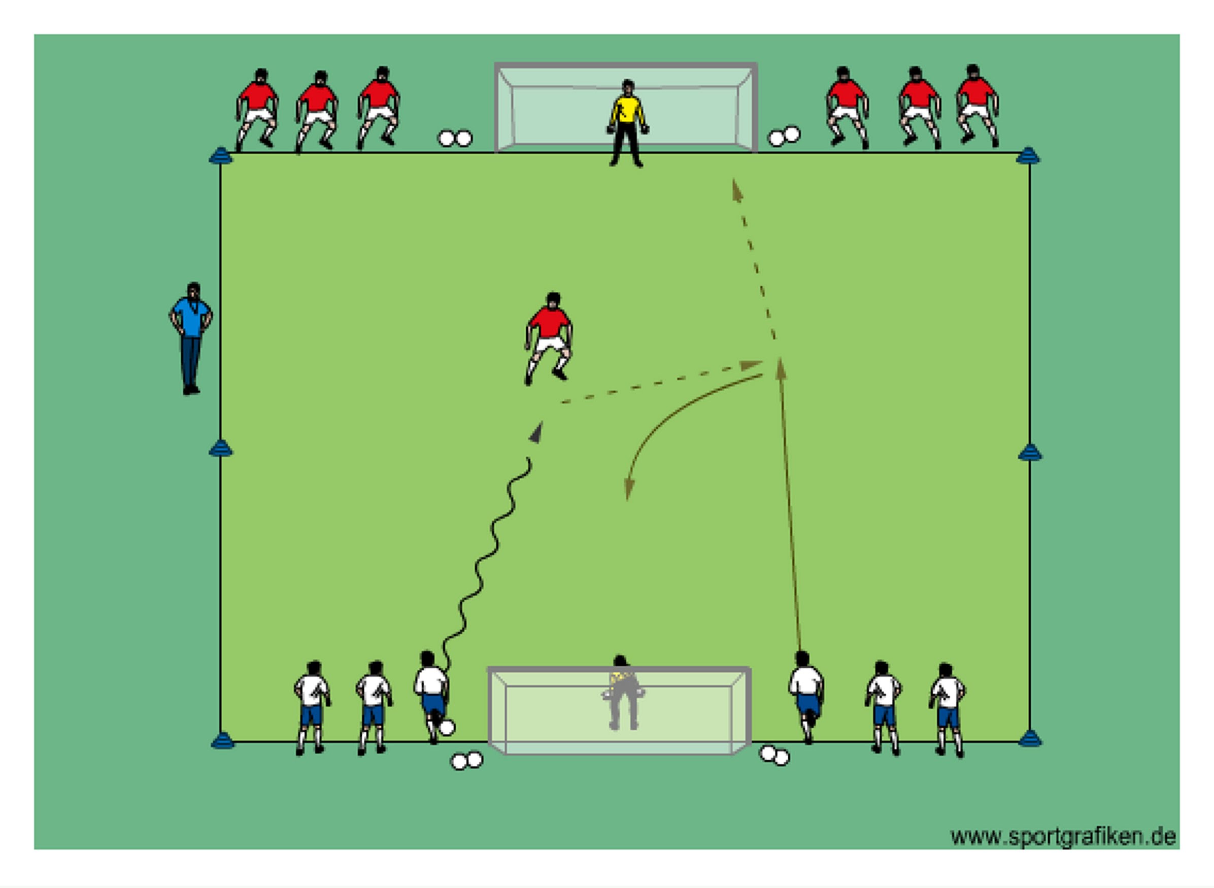 - first two players on the blue team attempt to score on the opposing goal in a 2v1 situation