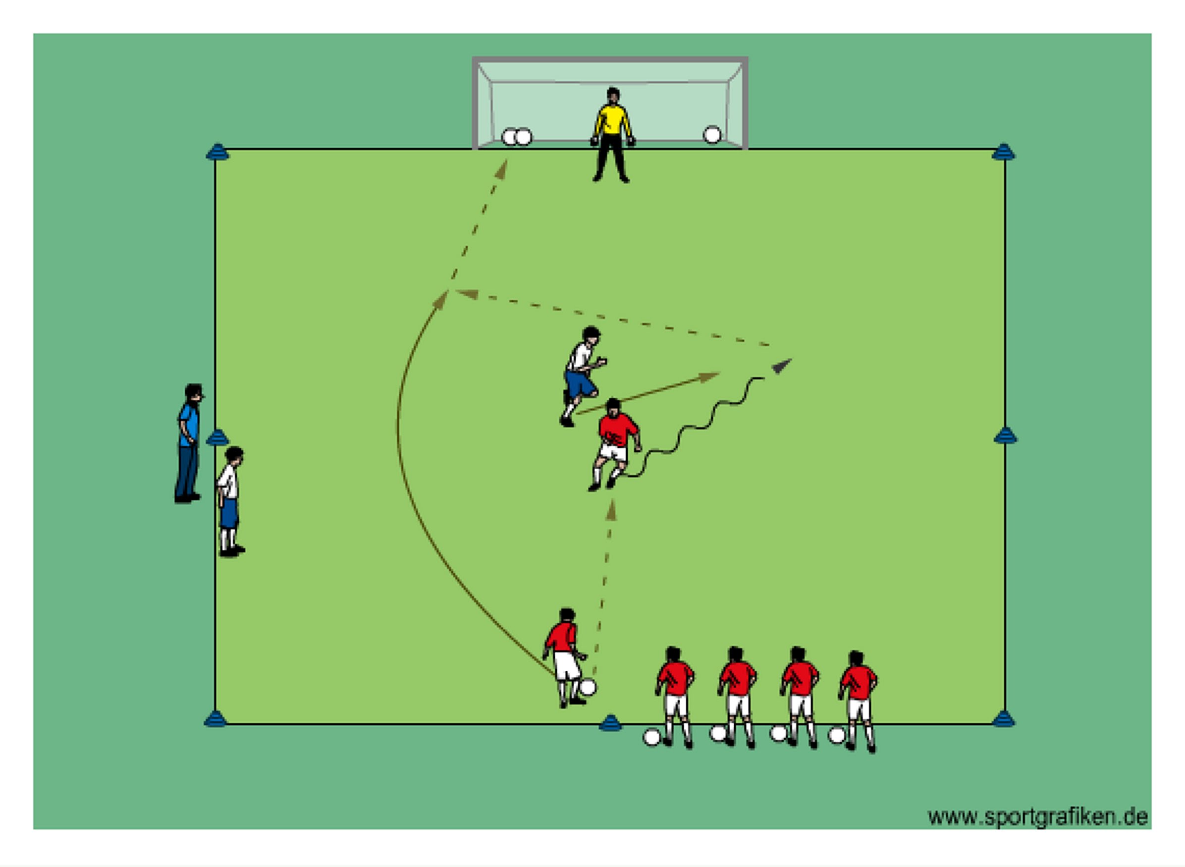 - on coach's command one player from each team attempts to dribble a ball from the middle of the grid back to his/her corner