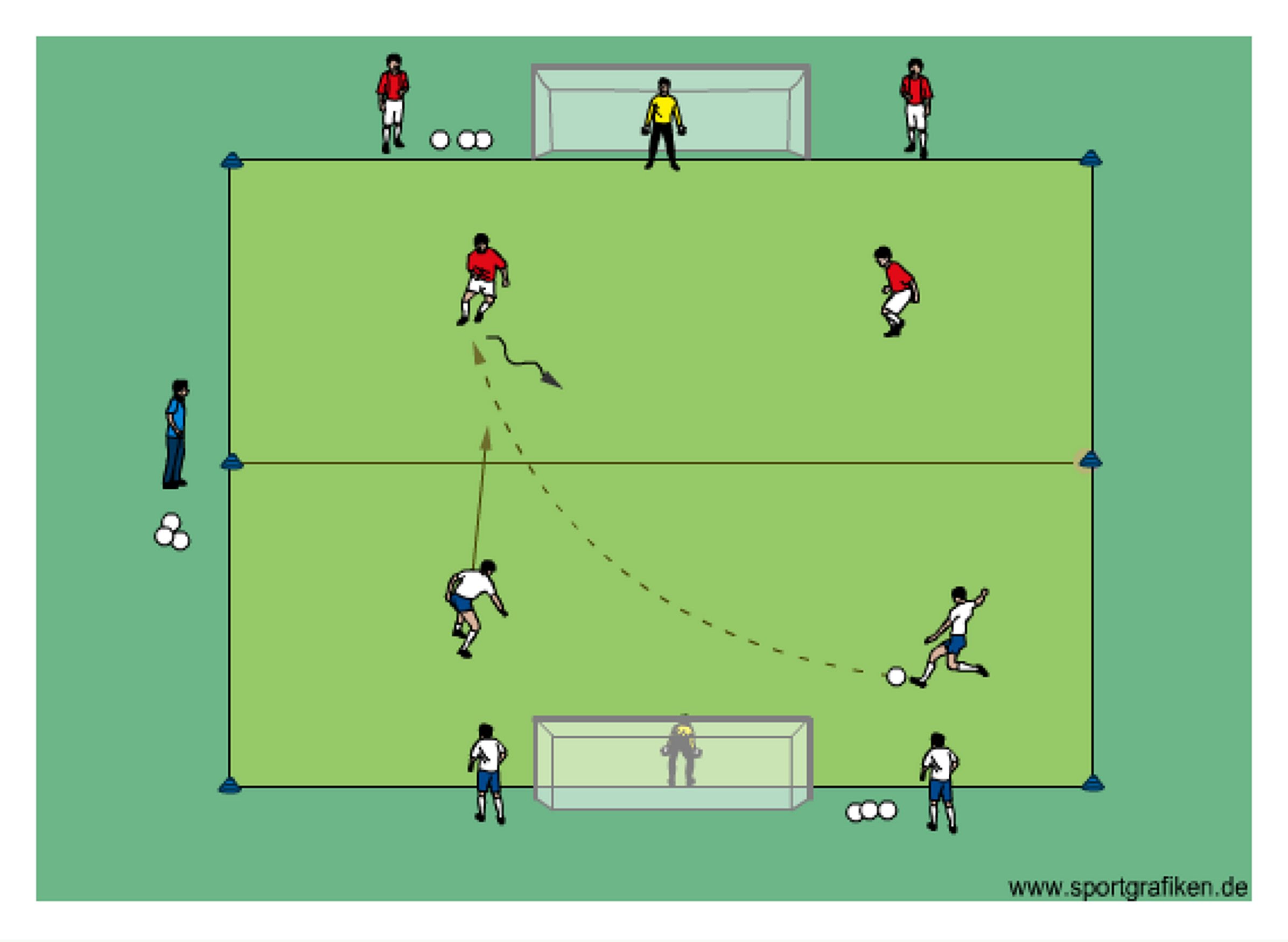 - play 2v2 with players from each team waiting on their goalline