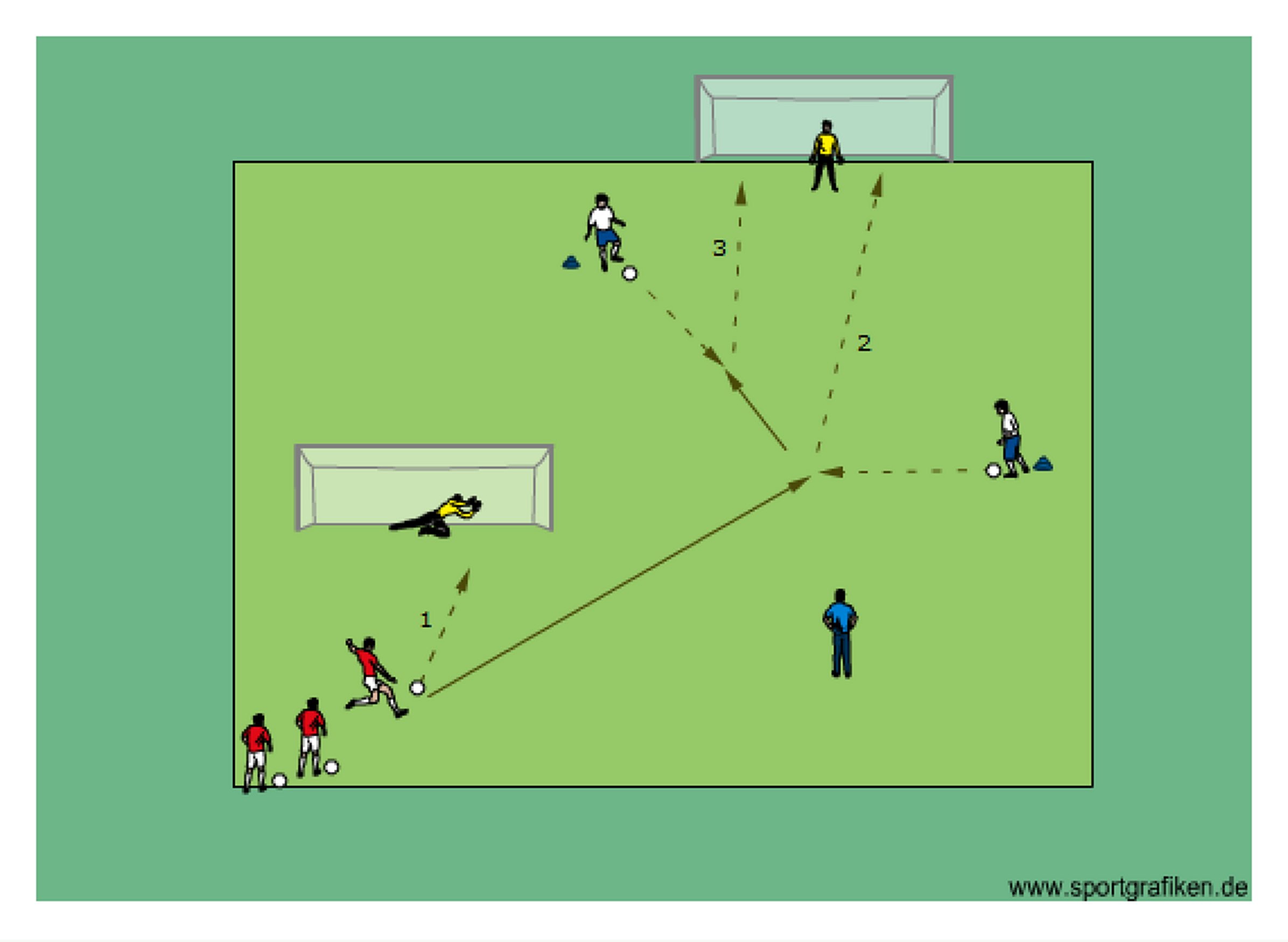 - second shot: player receives a pass from the side as shown (finish with instep)