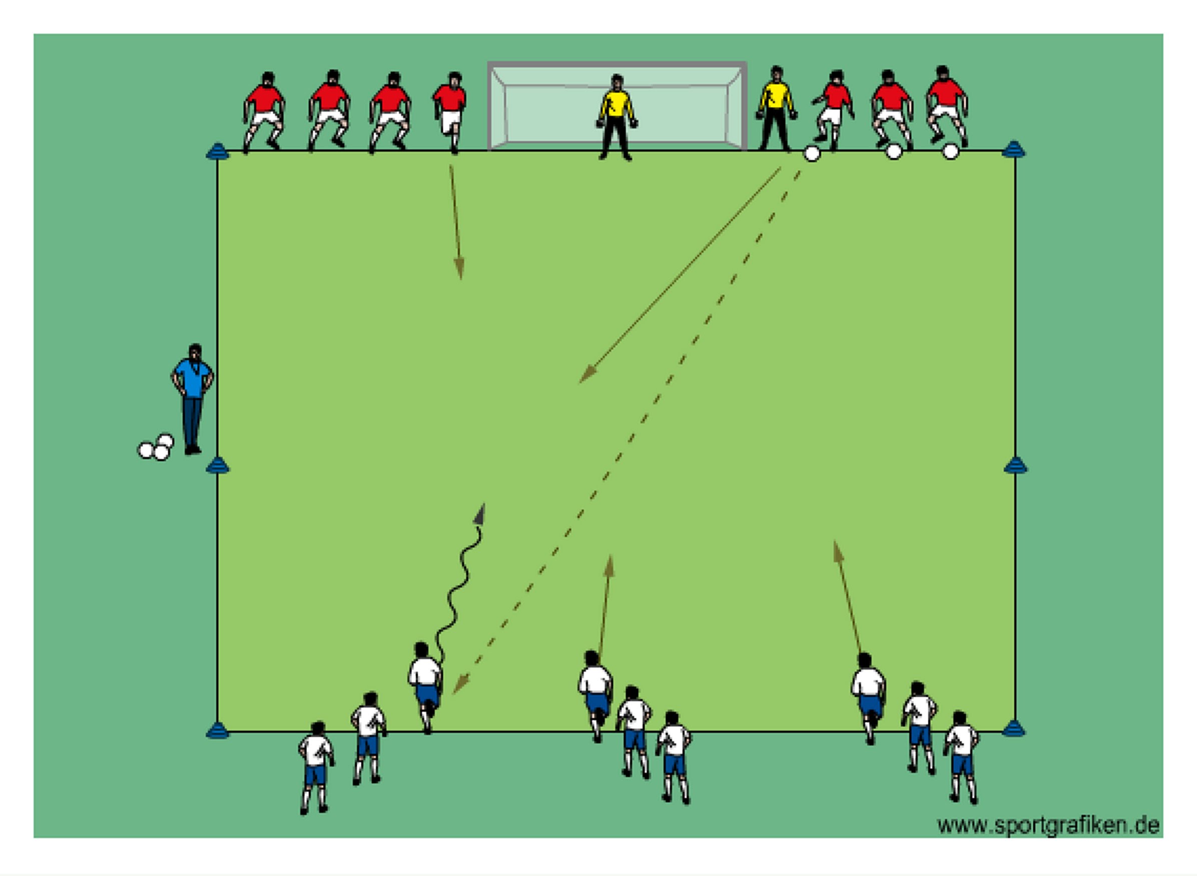 - player 1 passes to player 2 who receives the ball and attempts to finish on goal with the help of the