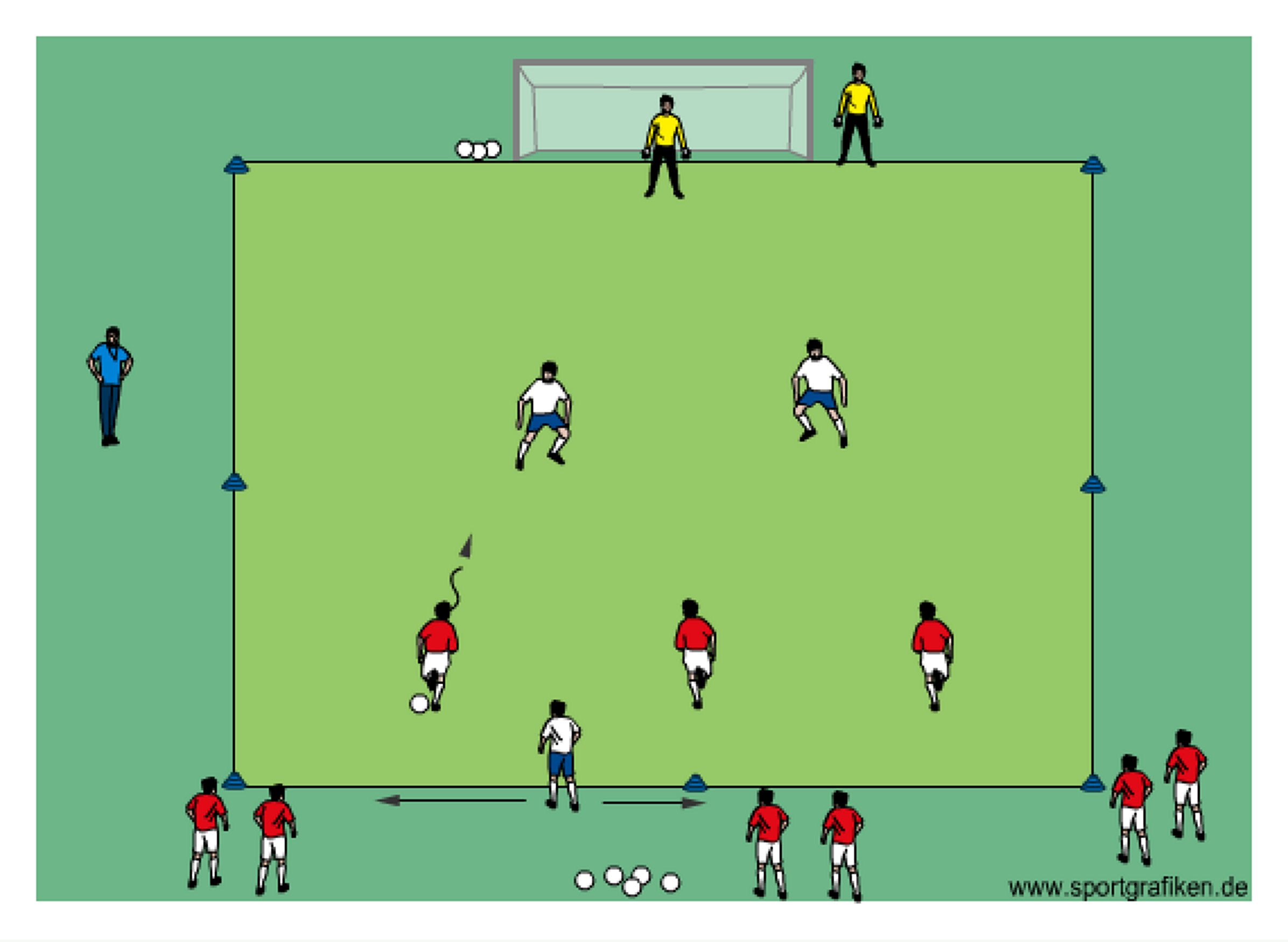 - the two defenders attempt to win the ball and pass to their target player at the endline opposite to the goal