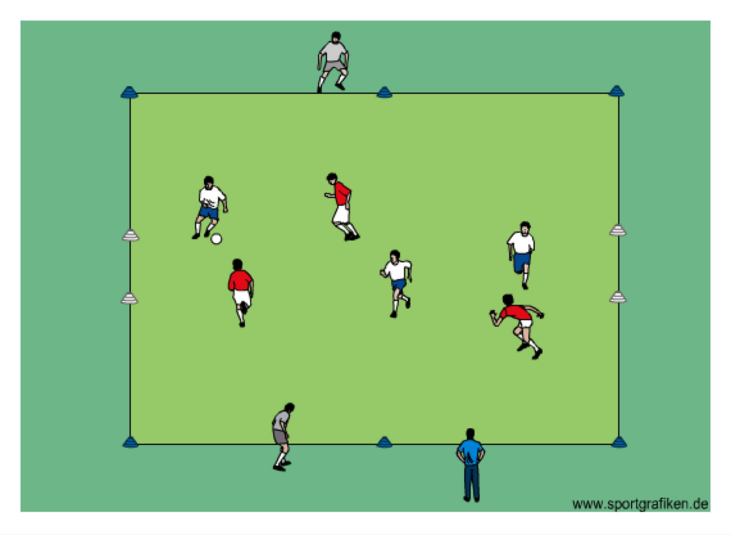 - teams have to pass to one of the target players before dribbling through one of the two cone goals