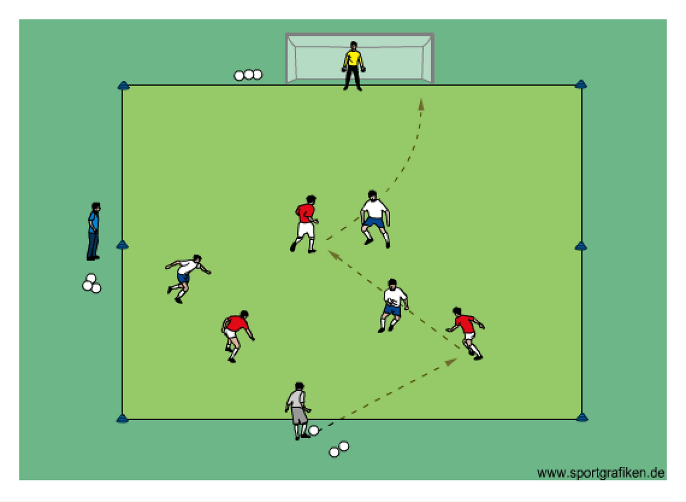 - play 3v3 with a ball feeder at the opposite side of the goal