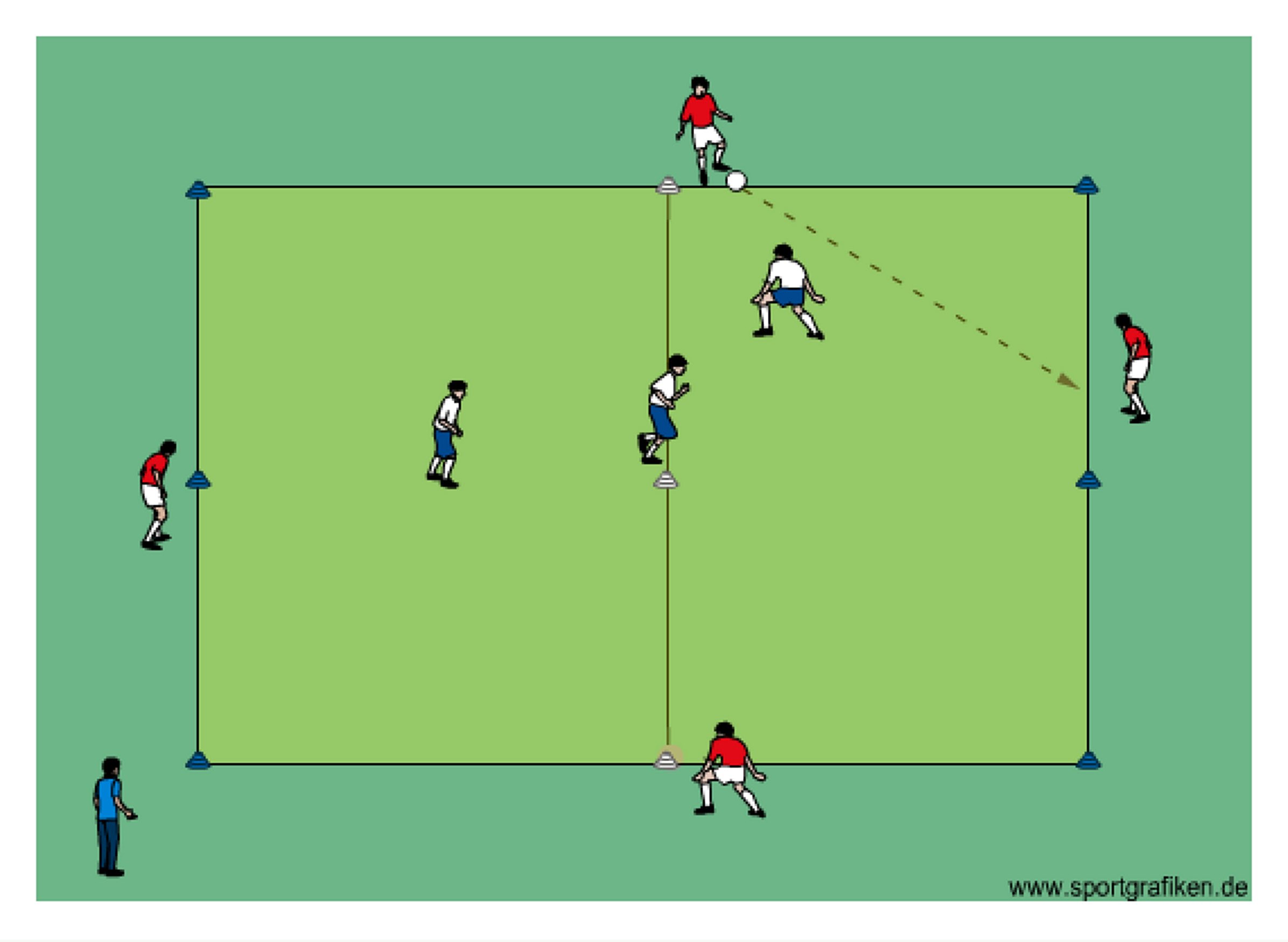 - one defender must stay in each half, the third defender is allowed to enter both halves