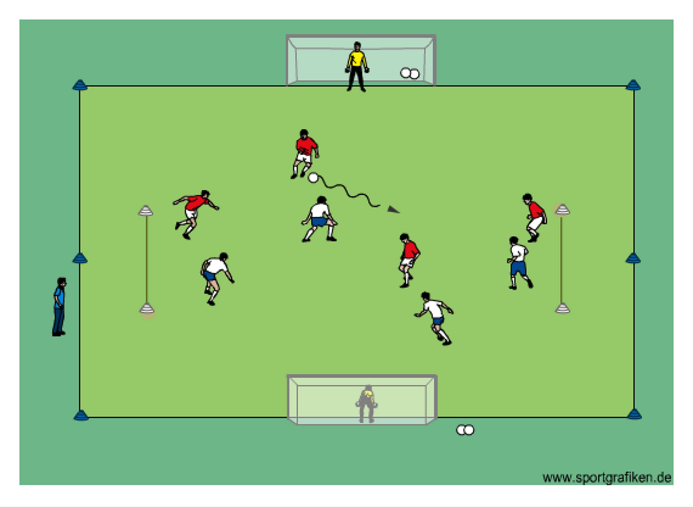 - each team defends one cone goal and can score on either goal with goalkeeper