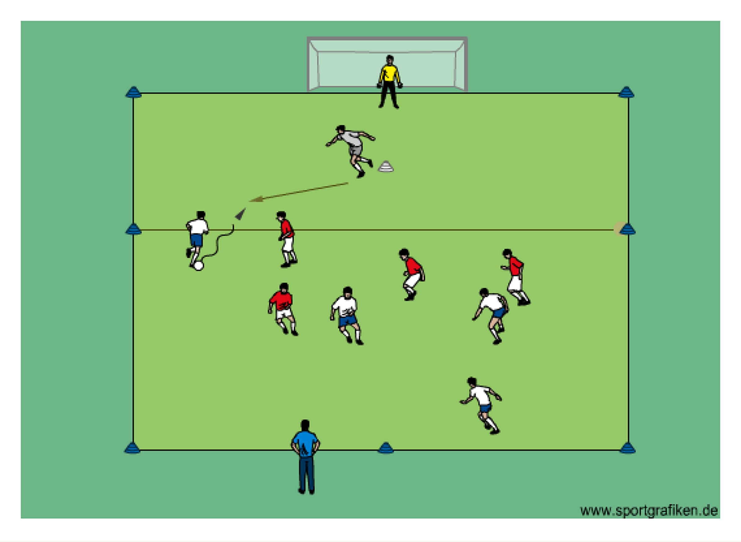 - attacker has to dribble across defender's end line to play 1v1 with last defender and then score on goalie