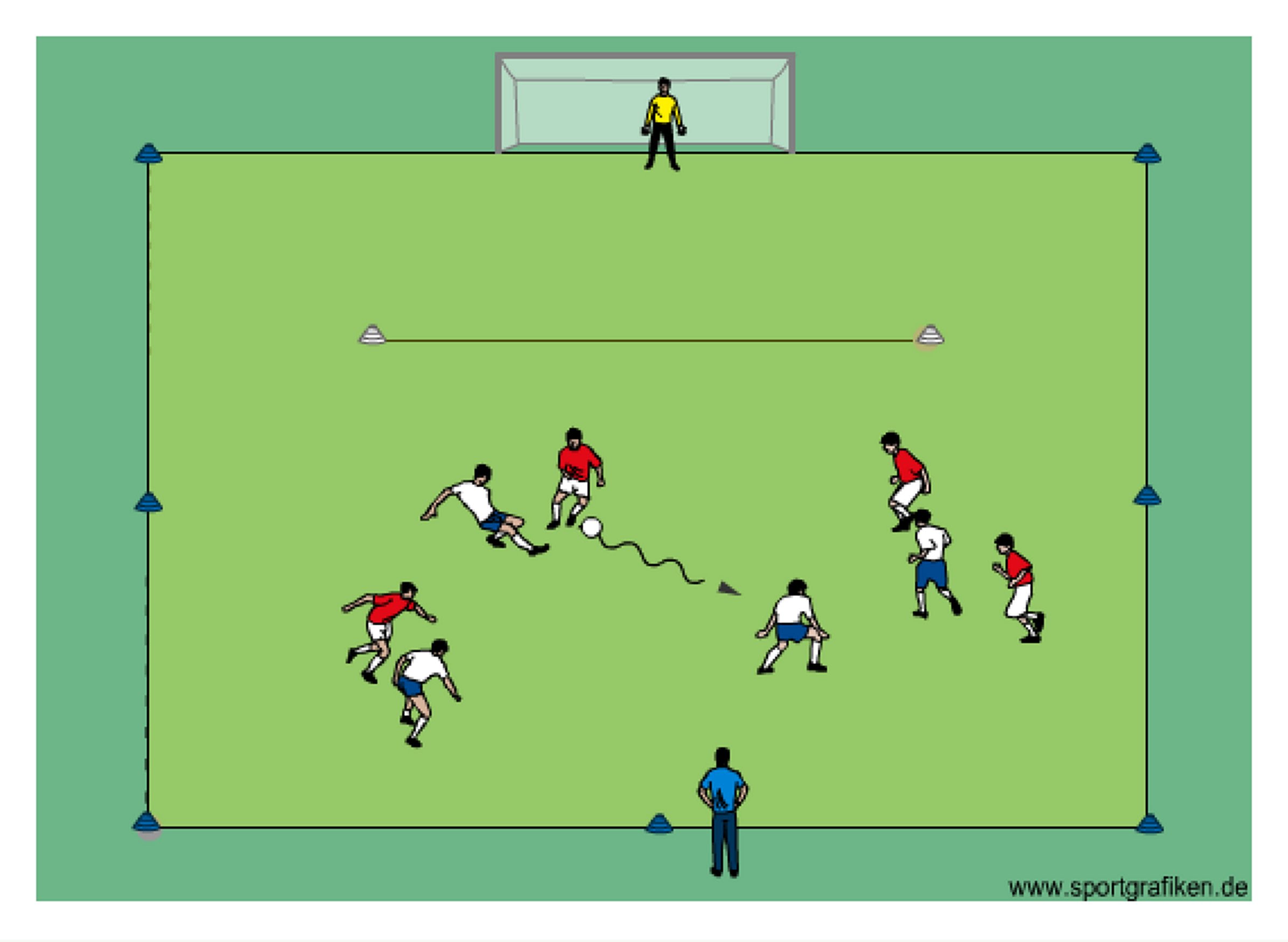 - attacker's objective is to dribble through cone goal which is set up in front of goal (attackers cannot be challenged once they are past the cone goal line - they go 1v1 with goalie)