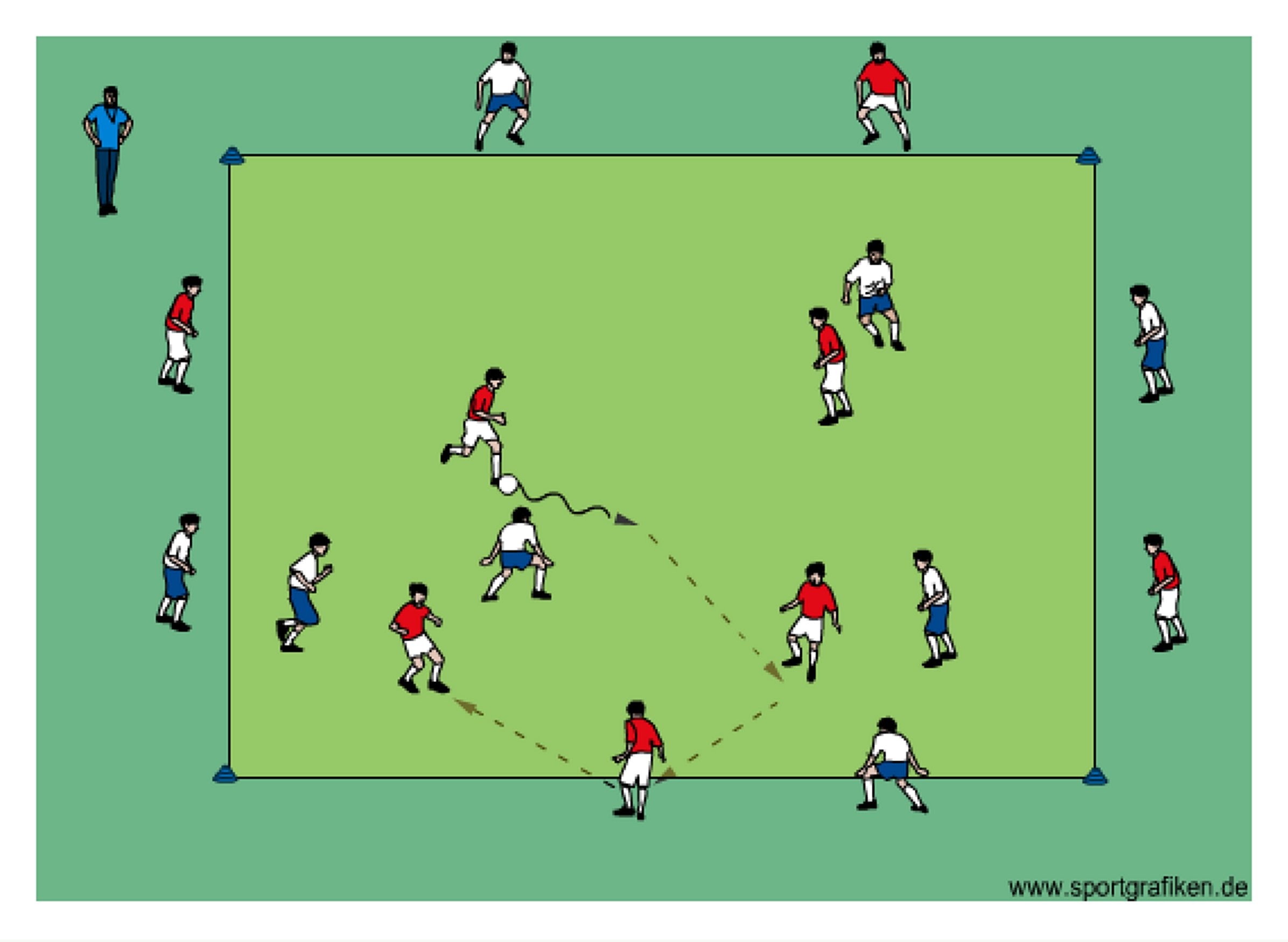 - 3 teams. 2 teams play 4v4 inside the playing area