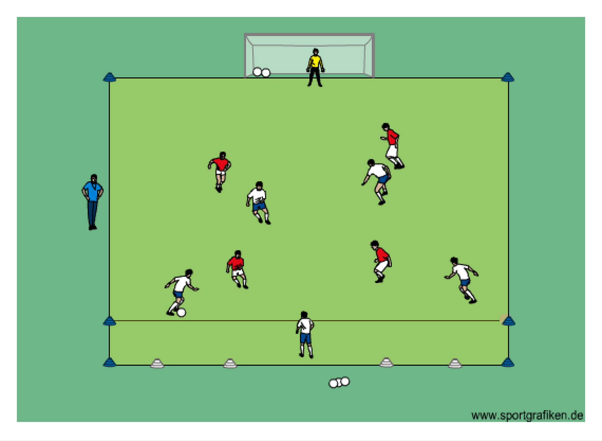 - attacking team defends 2 cone goals with sweeper keeper (keeper covers both goals)