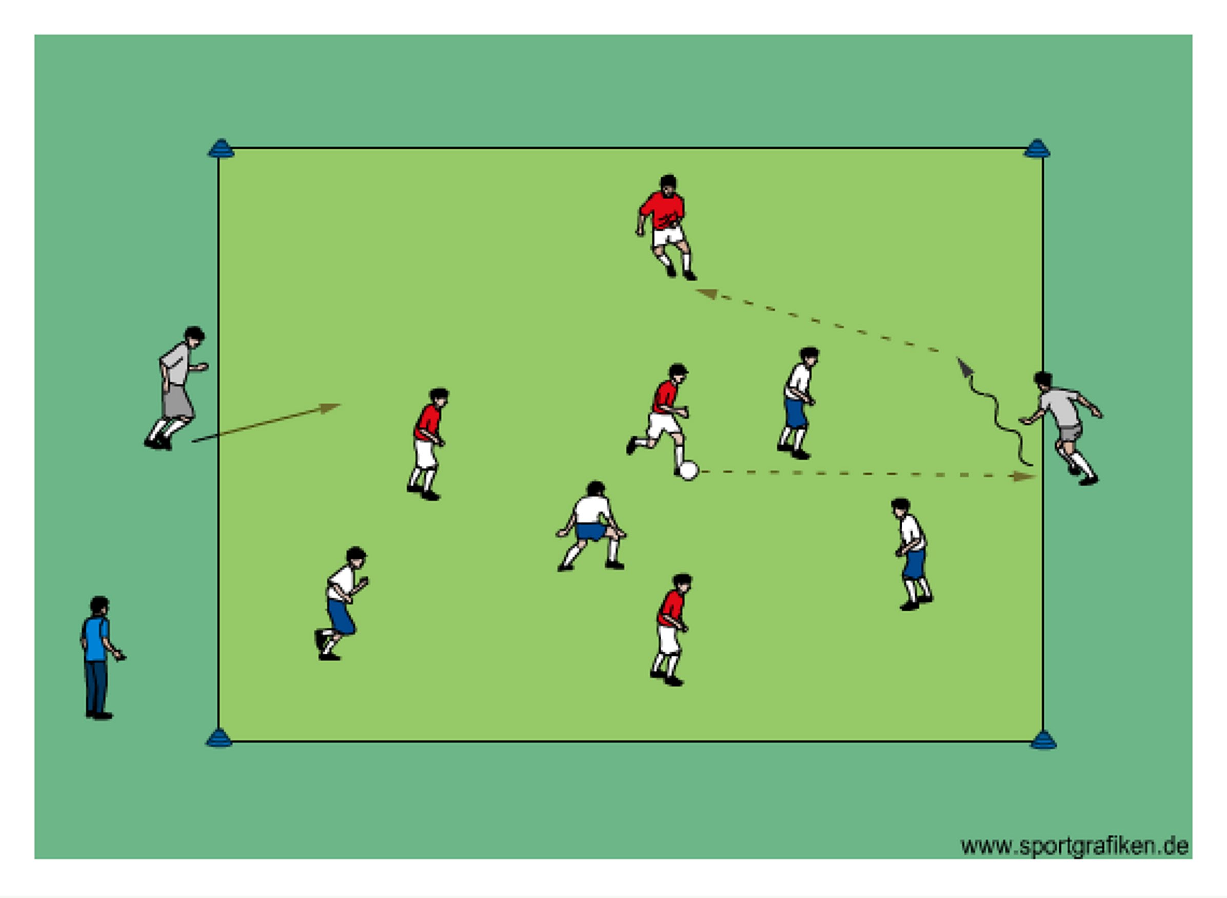 - teams score if they complete a pass to a neutral player who then dribbles onto the grid and helps