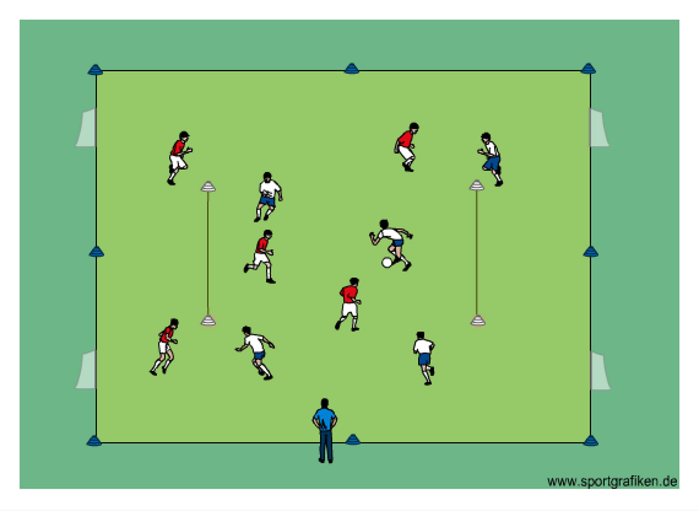 - teams must dribble through the cone goal in the attacking half before they can score on one of the