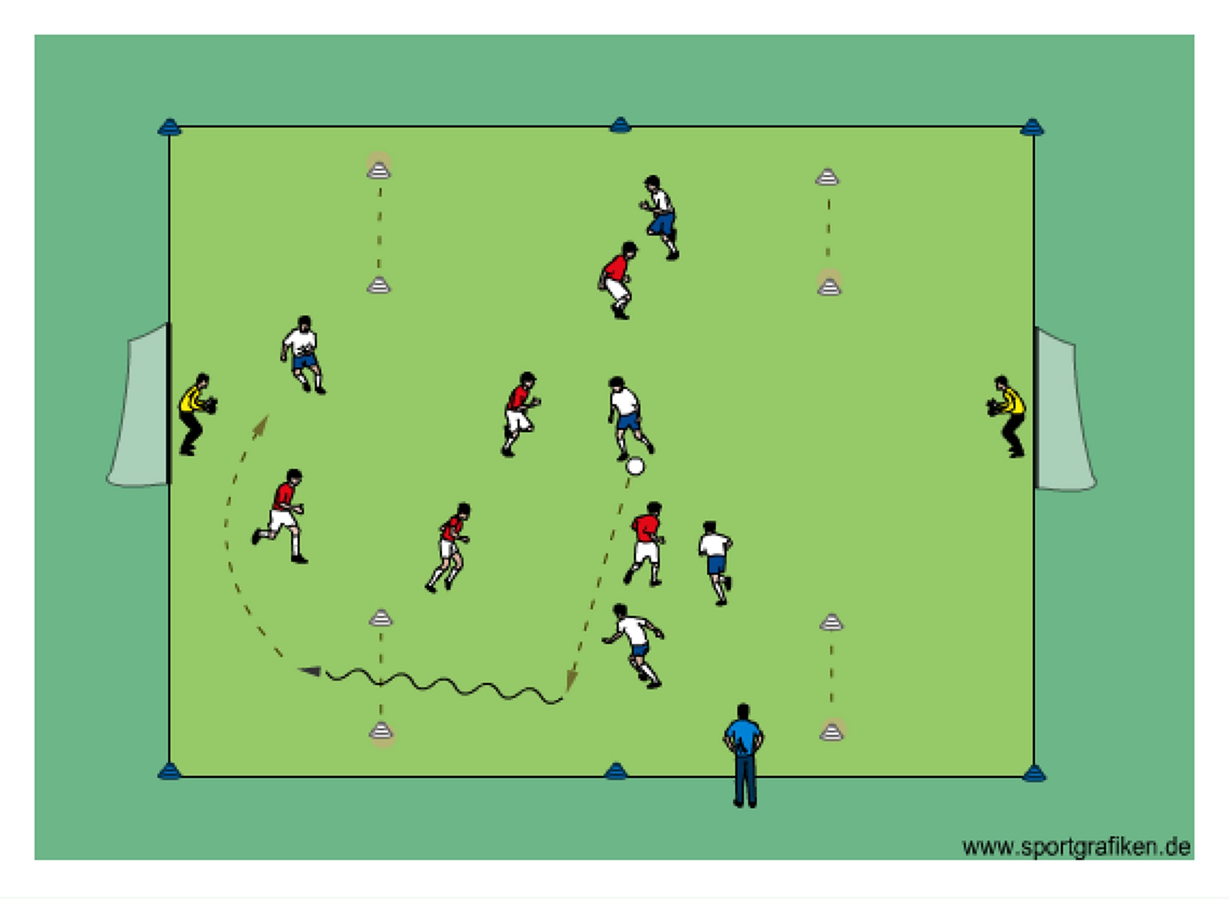 - teams must connect a pass through one of the two cone goals in the attacking half before they can score