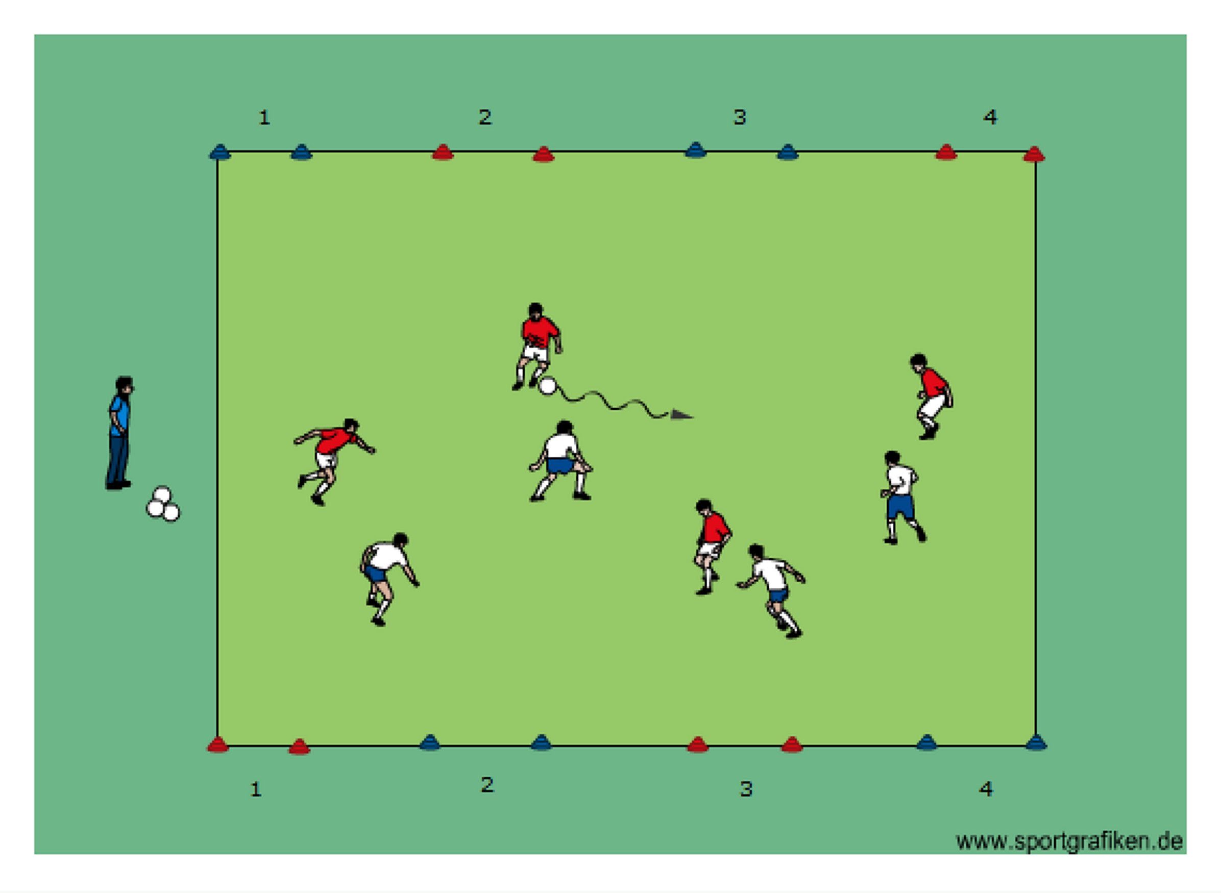 • each team defends and attacks 4 cone goals