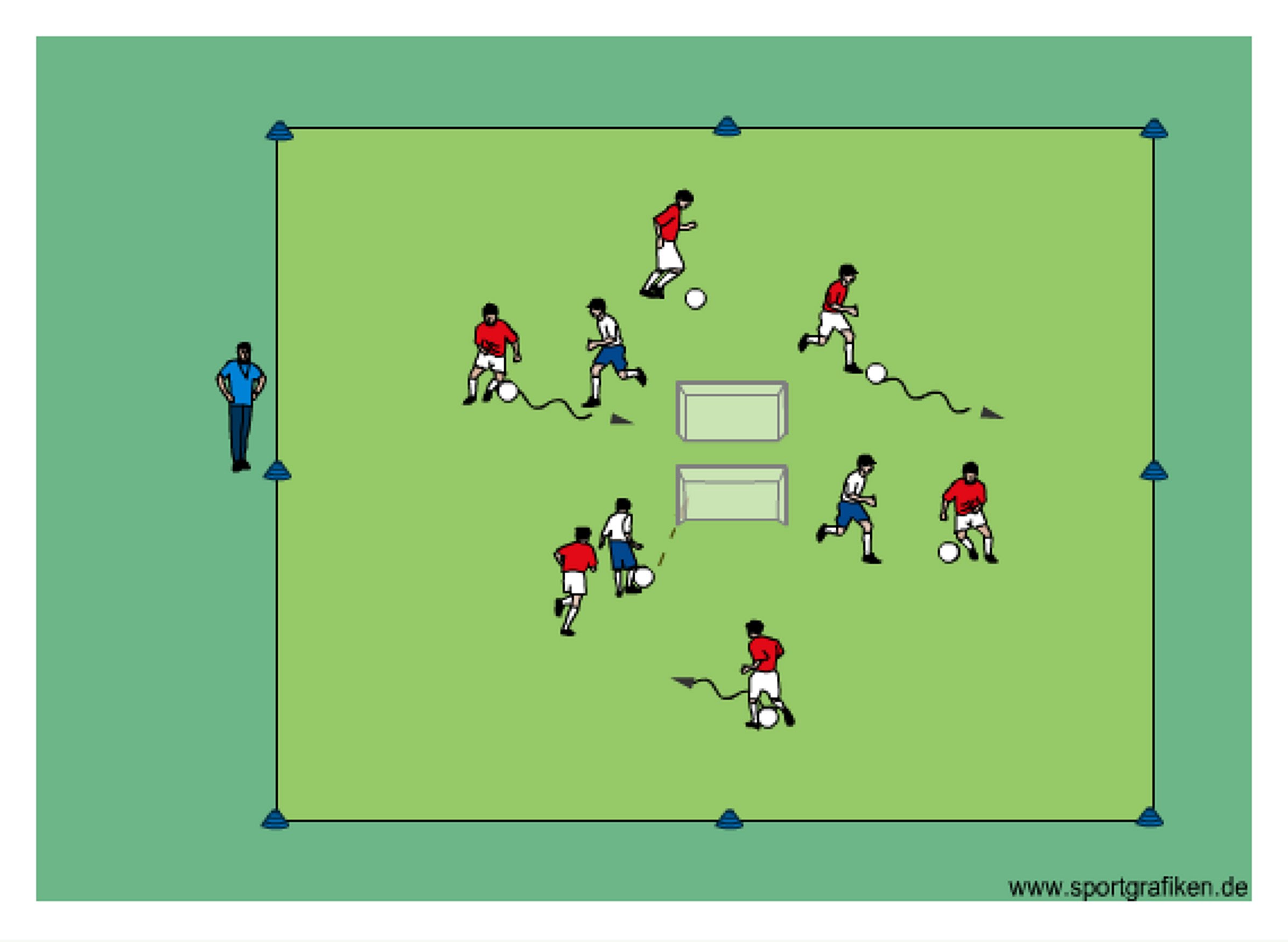 - defenders attempt to take the ball away from the attacker(red) and score on the mini goal