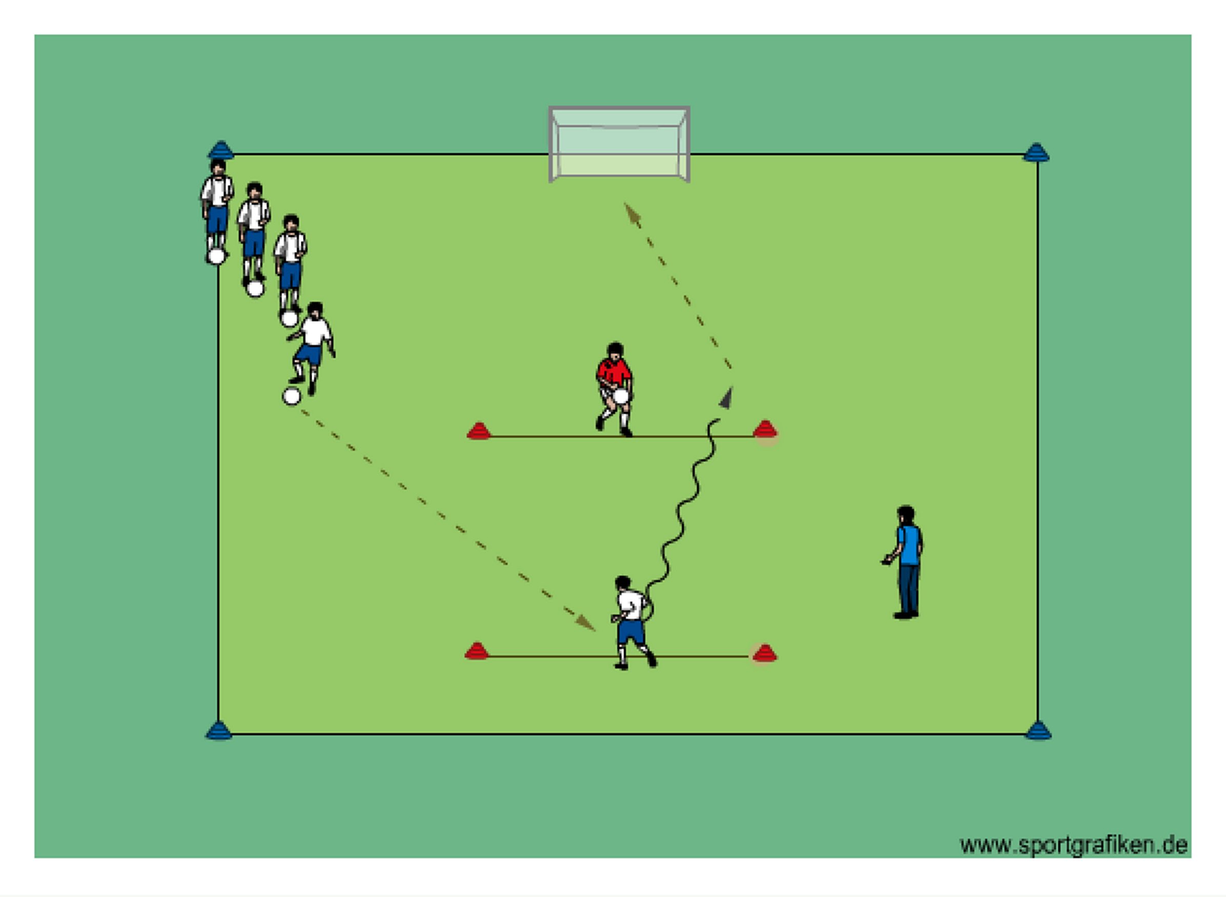 • the ball is passed to the attacker who must dribble past the defender and finish with a shot on the