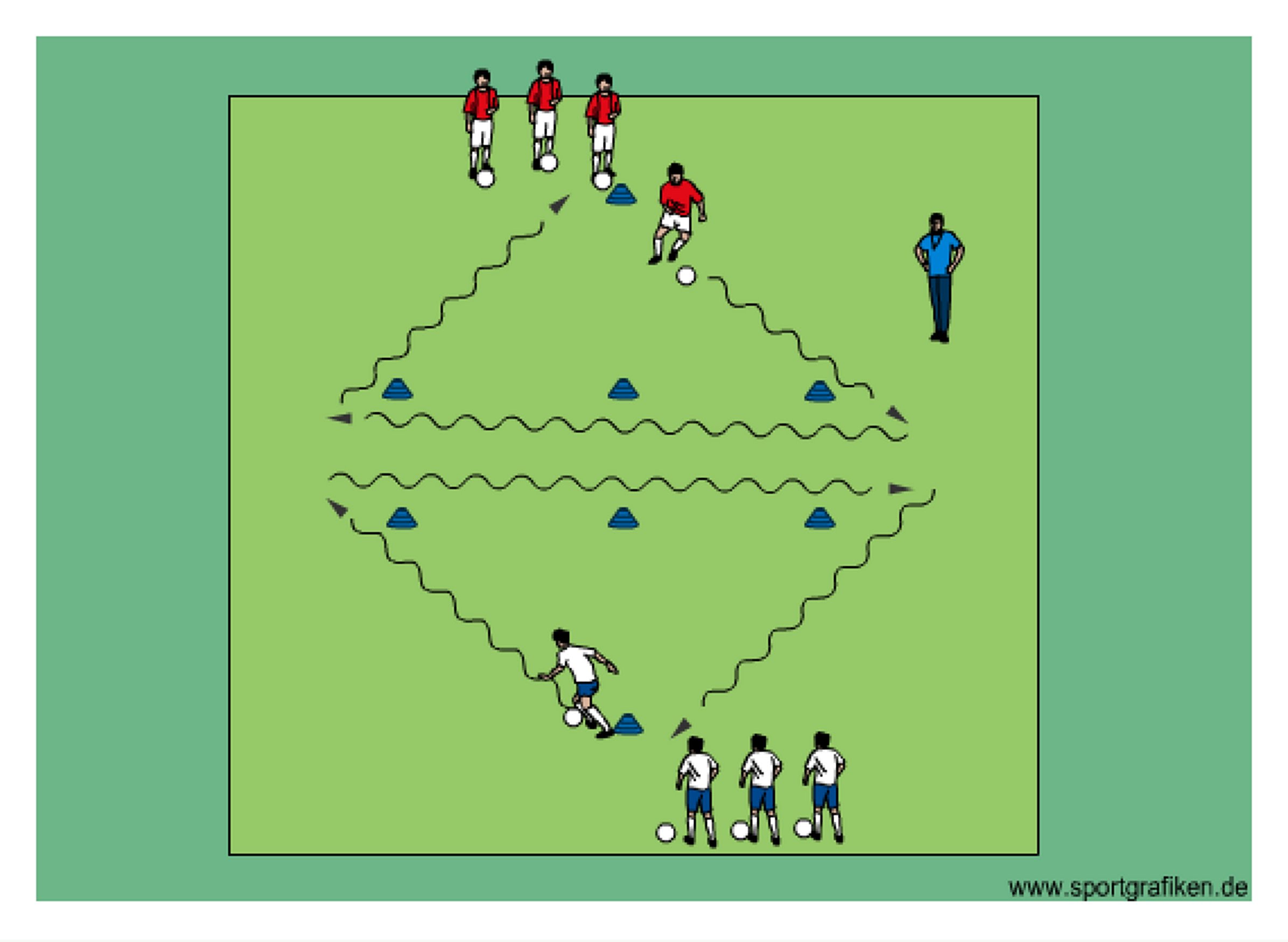 - players dribble around cones as shown
