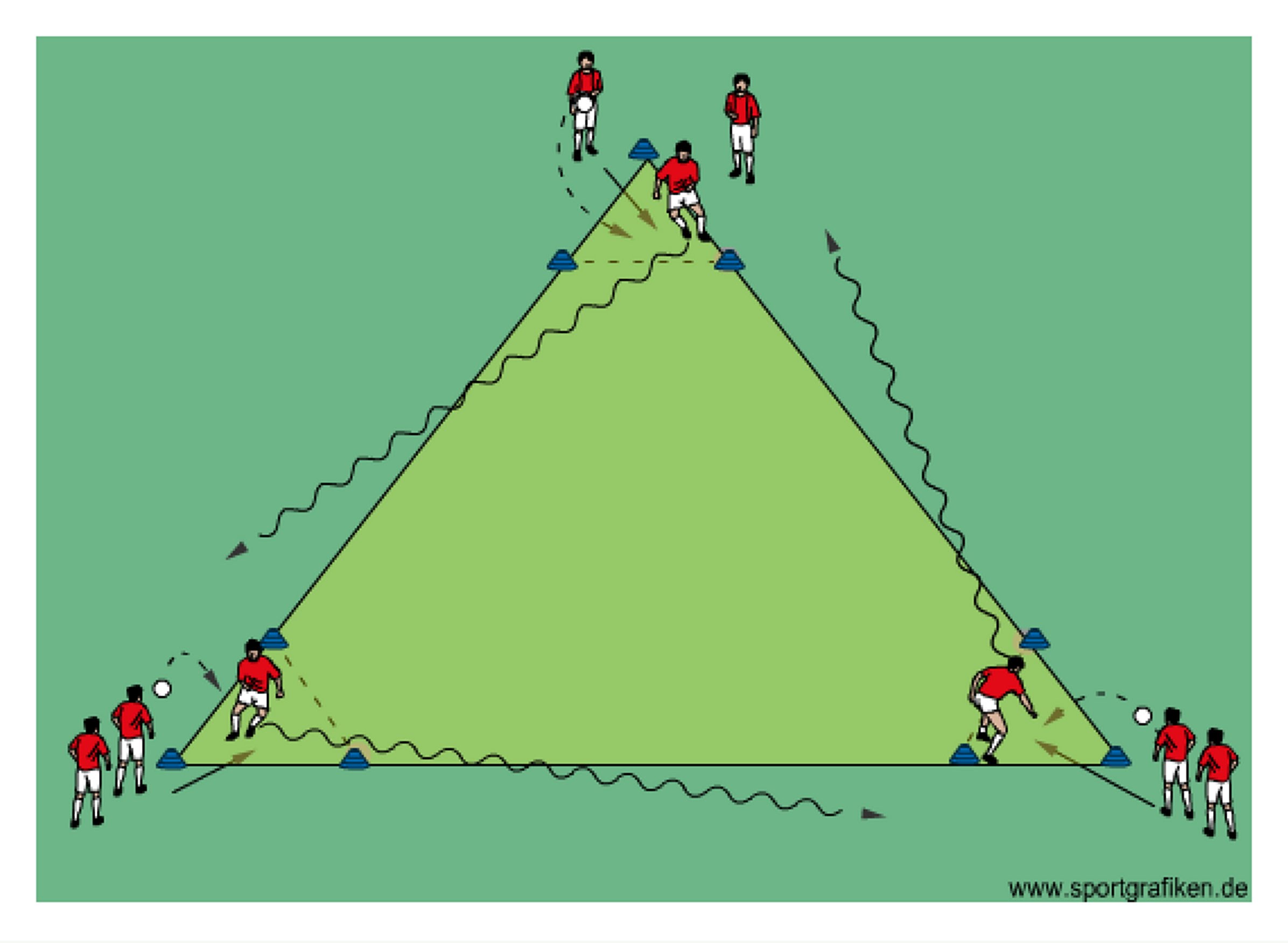 - first player runs without a ball to the group to his left, receives the ball and dribbles to next group in a clockwise direction