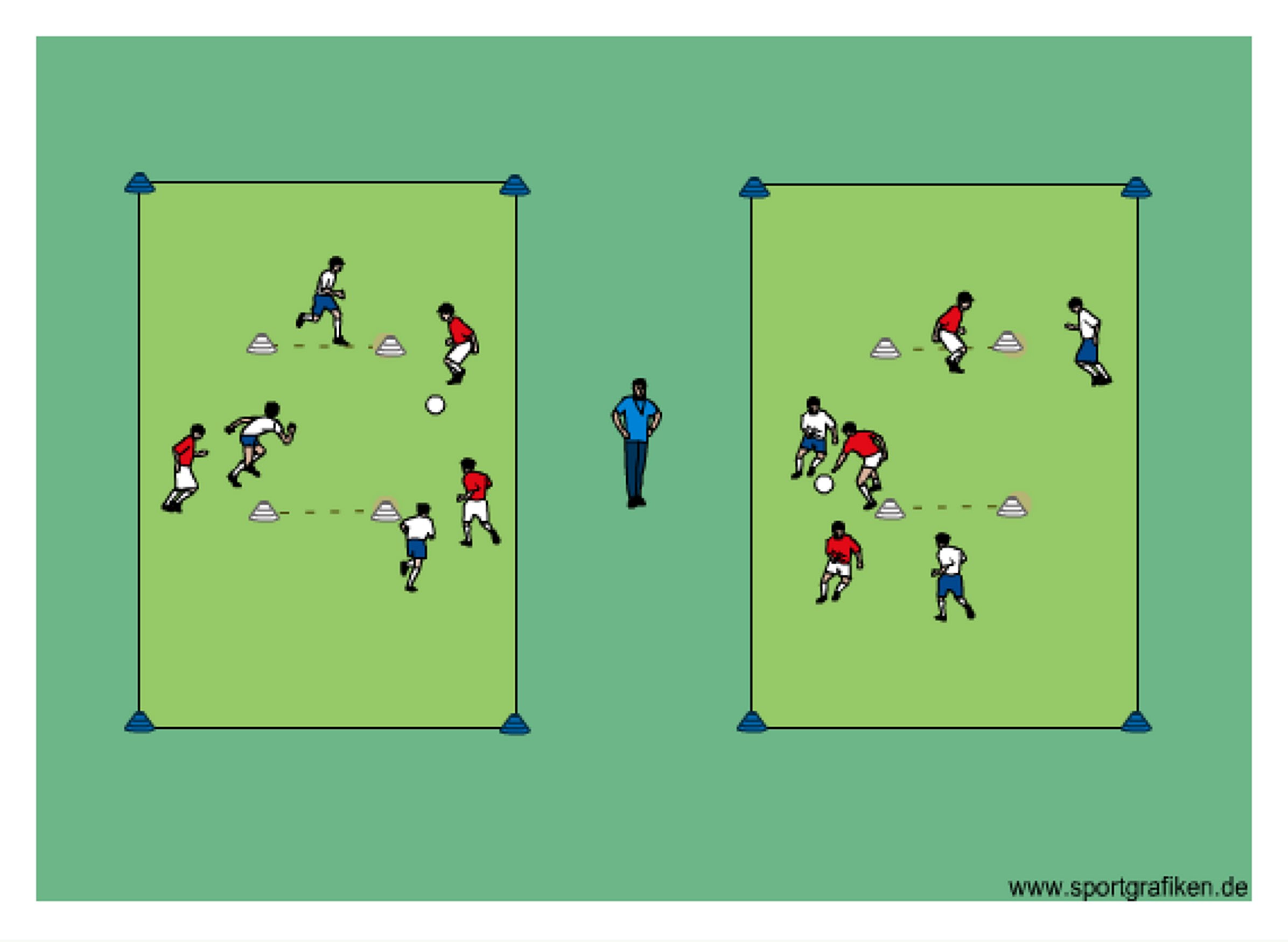 - teams score by dribbling through a cone goal and then connecting a pass to a teammate